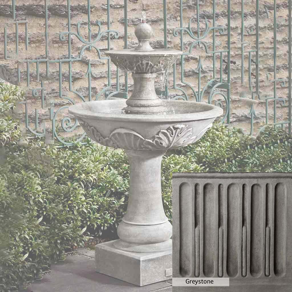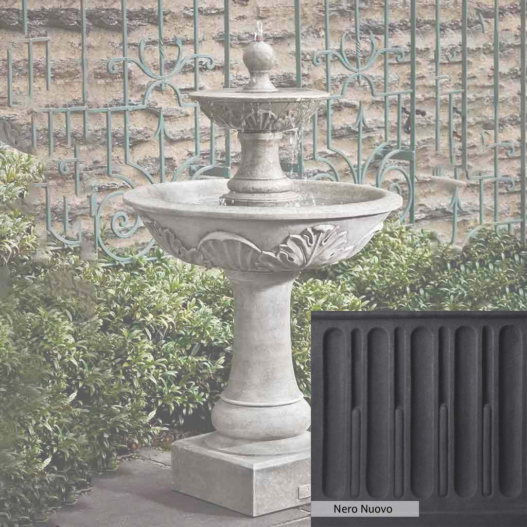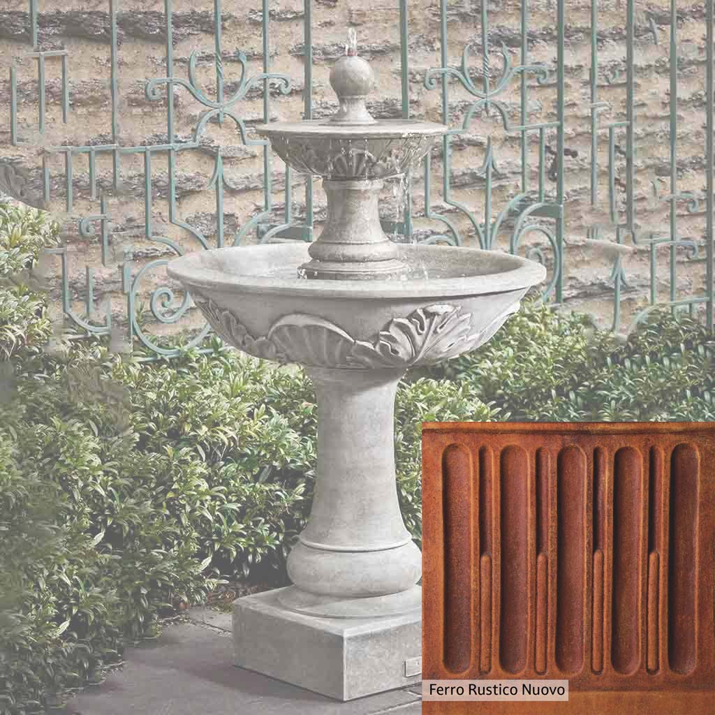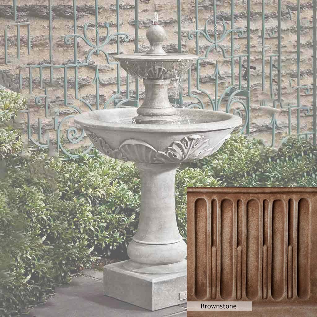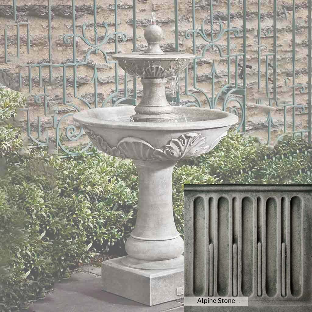 Skilled artisans in the USA handcraft the Acanthus Two Tiered Fountain. The Campania team applies the unique patina using their experience, making each piece one-of-a-kind. This fountain is shown in the Alpine Stone color. Campania International's unique cast stone blend is meticulously molded to create each piece used in the construction of this fountain. Due to the materials, manufacturing processes, and variations in photography conditions, natural differences can occur in size, weight, and color. The actual color may vary from the photo.
