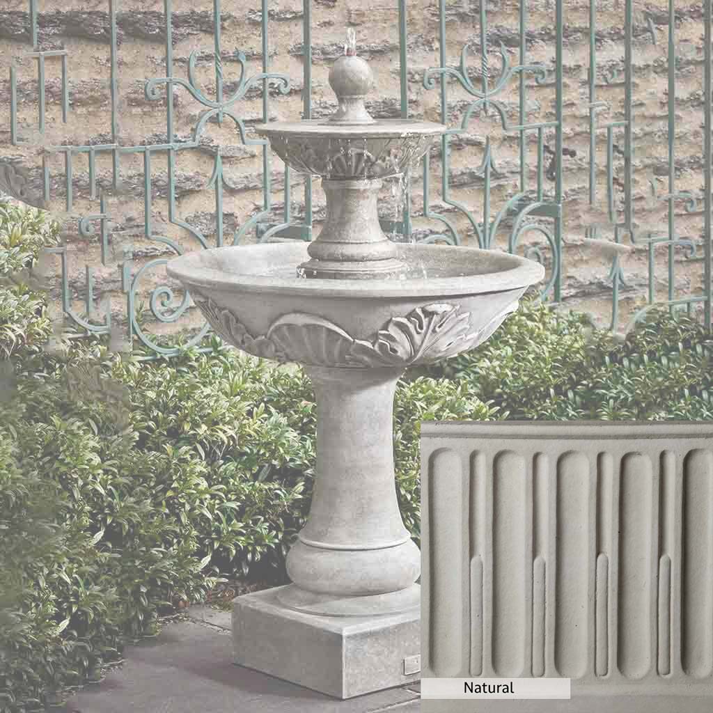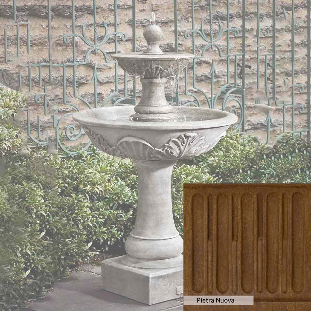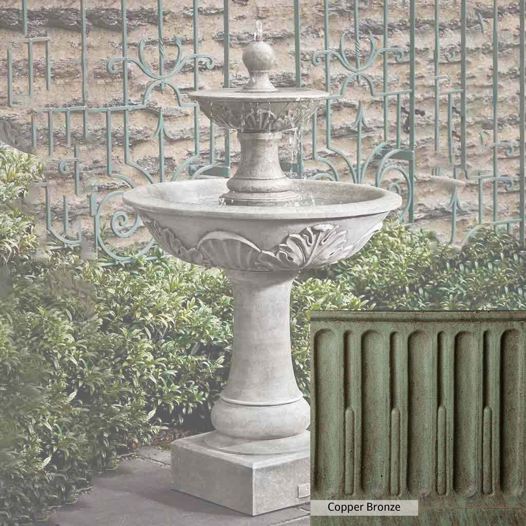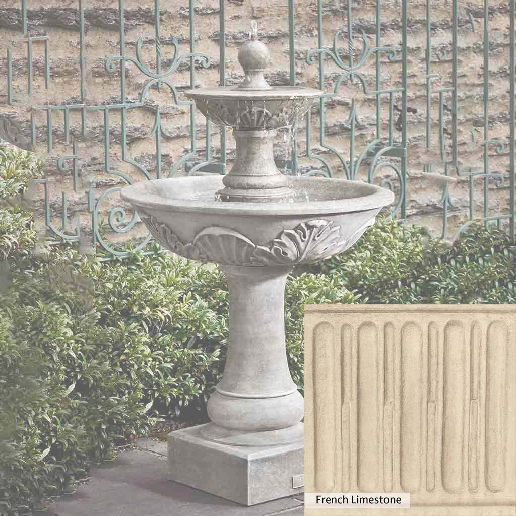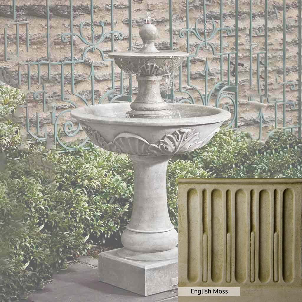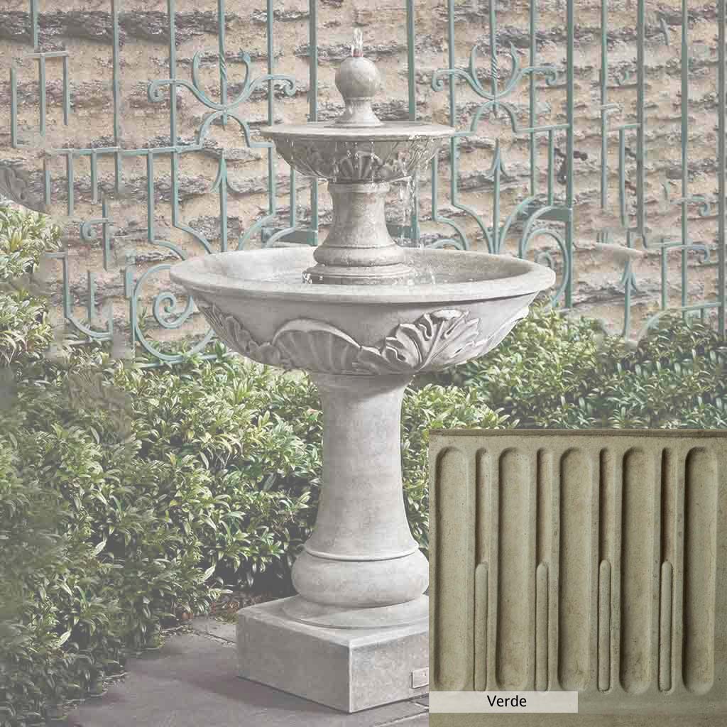 Skilled artisans in the USA handcraft the Acanthus Two Tiered Fountain. The Campania team applies the unique patina using their experience, making each piece one-of-a-kind. This fountain is shown in the Alpine Stone color. Campania International's unique cast stone blend is meticulously molded to create each piece used in the construction of this fountain. Due to the materials, manufacturing processes, and variations in photography conditions, natural differences can occur in size, weight, and color. The actual color may vary from the photo.
