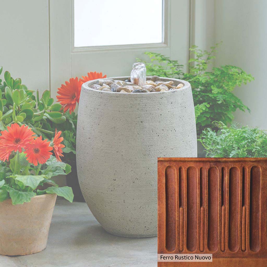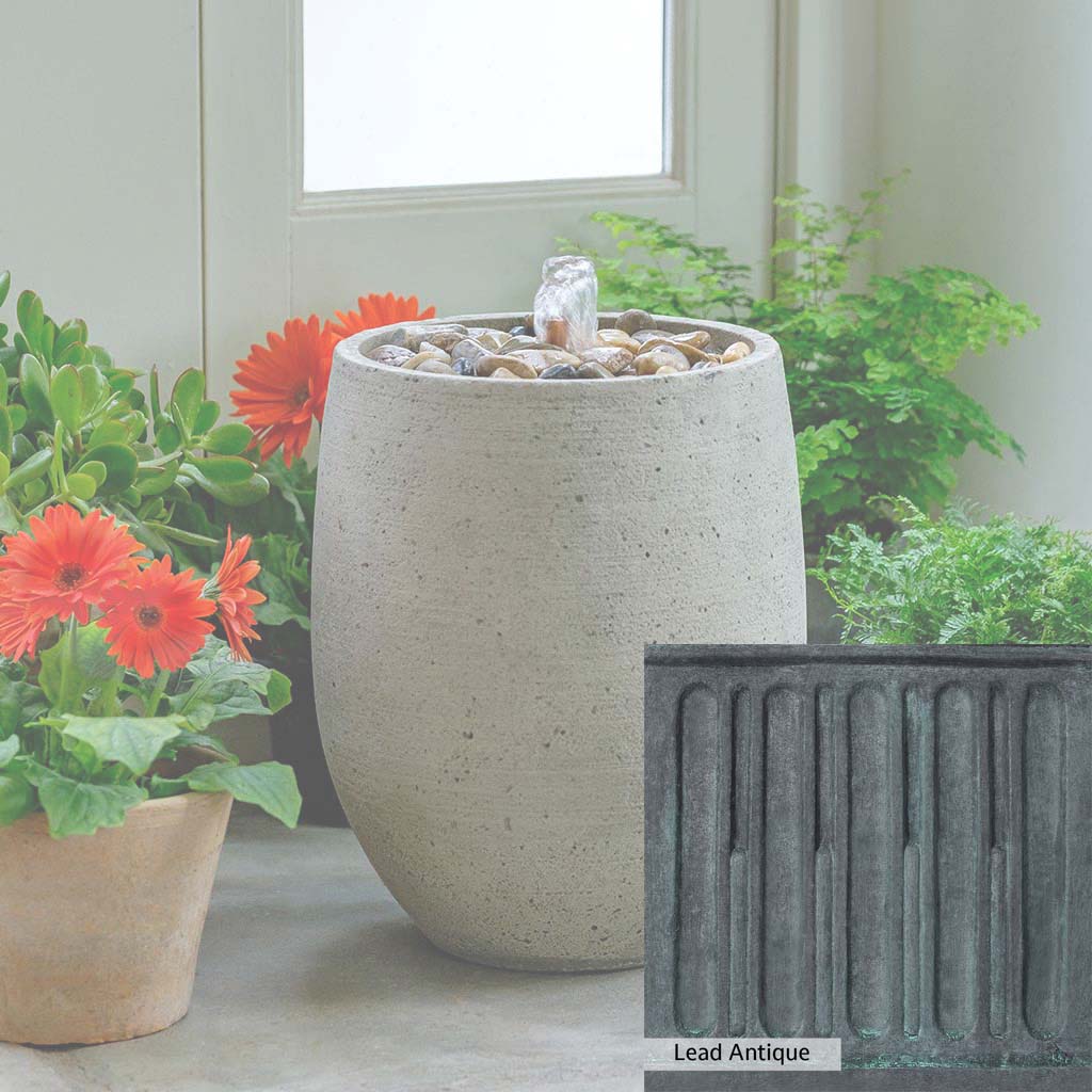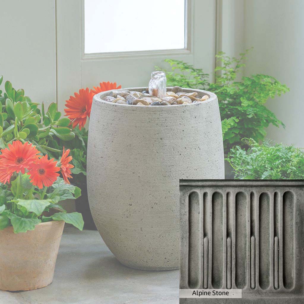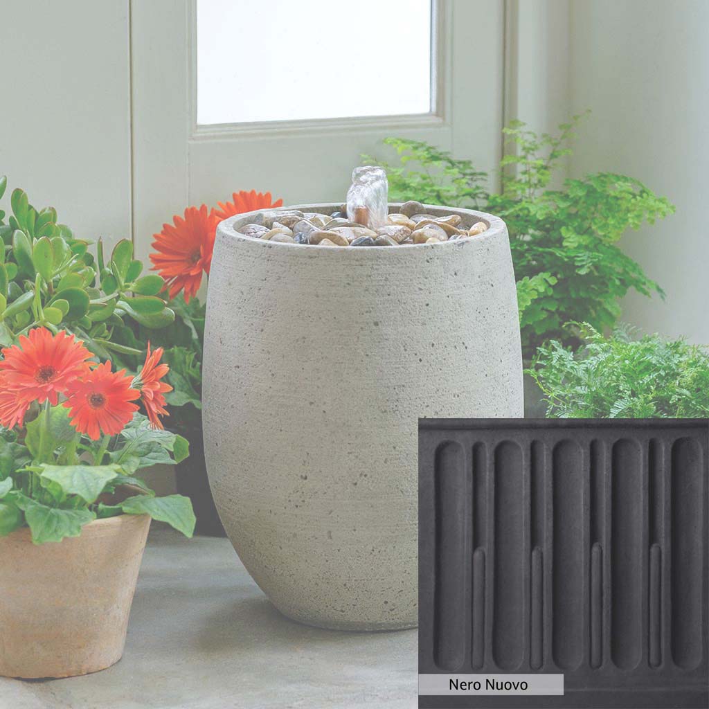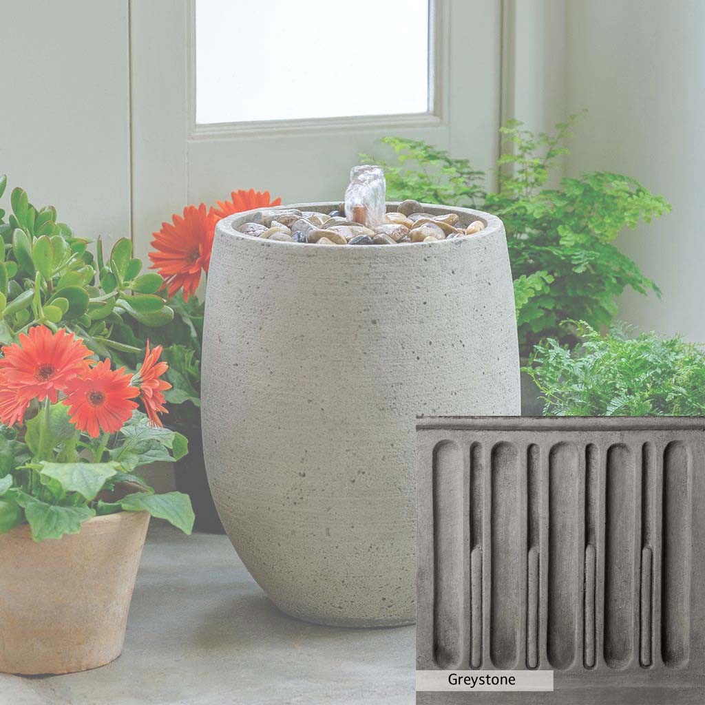 The Bebel Pebble Fountain is handcrafted by skilled artisans in the USA. With their extensive experience, the Campania team applies a unique patina to ensure that each piece is special. This fountain is shown in the Greystone color. Campania International's proprietary cast stone blend is meticulously molded to create each piece used in the construction of this fountain. Due to the use of different materials and manufacturing processes, as well as varying photography conditions, natural variations in size, weight, and color can occur. The actual color may differ from the photo.
