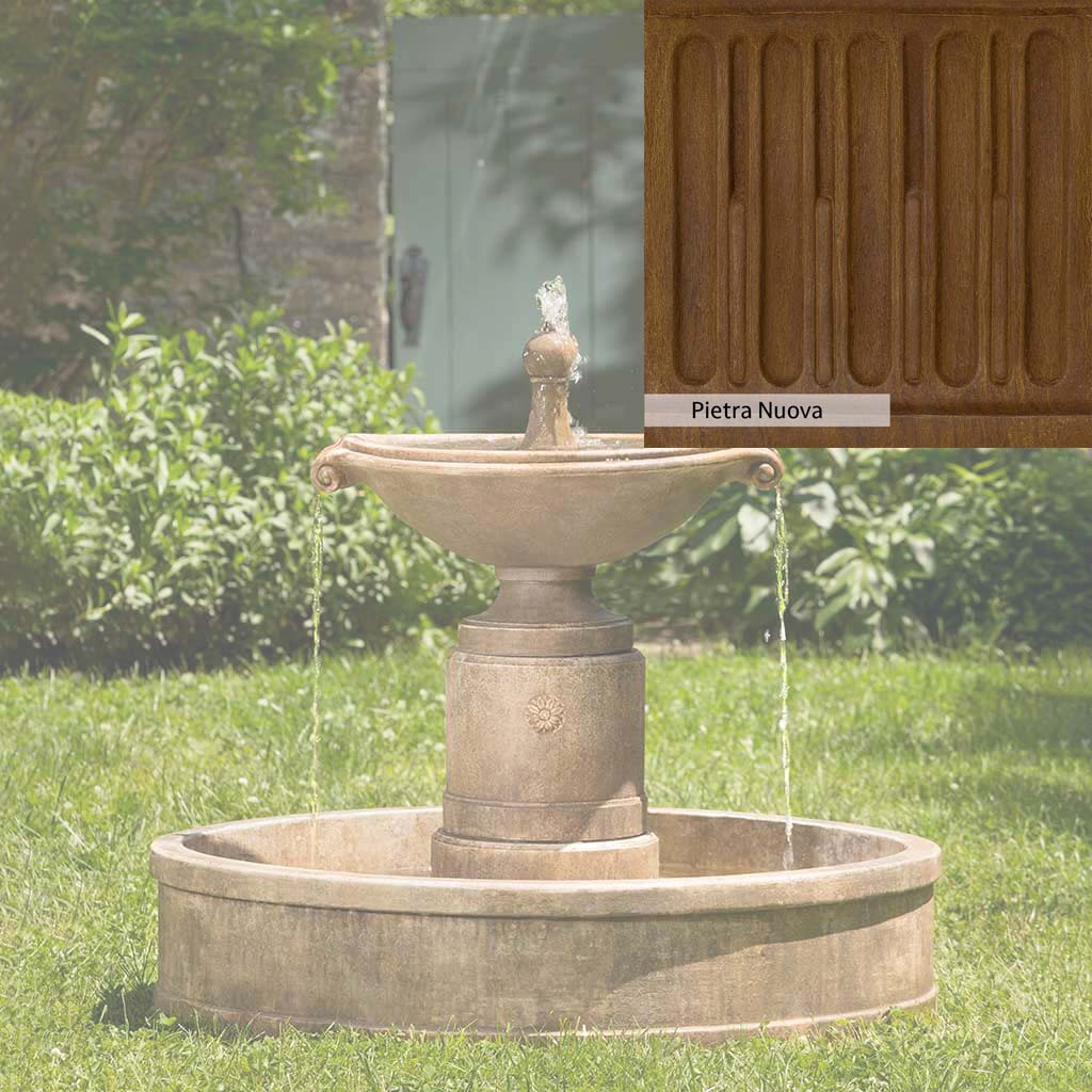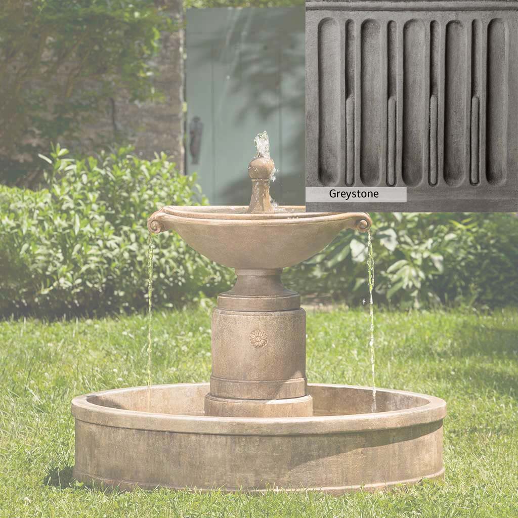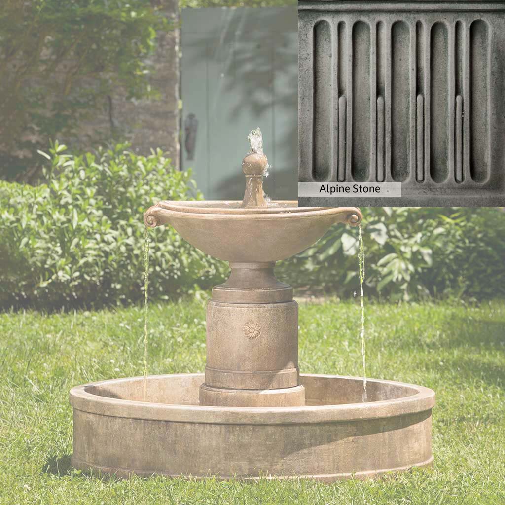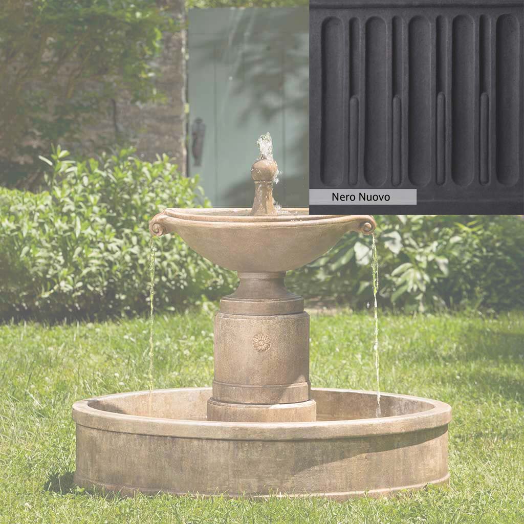 Skilled artisans in the USA handcraft the Borghese Fountain in Basin. The Campania team applies a unique patina, making each piece one-of-a-kind. This fountain is shown in the Pietra Nuova color. Due to materials, manufacturing processes, and variations in photography conditions, natural differences can occur in size, weight, and color. The actual color may vary from the photo.