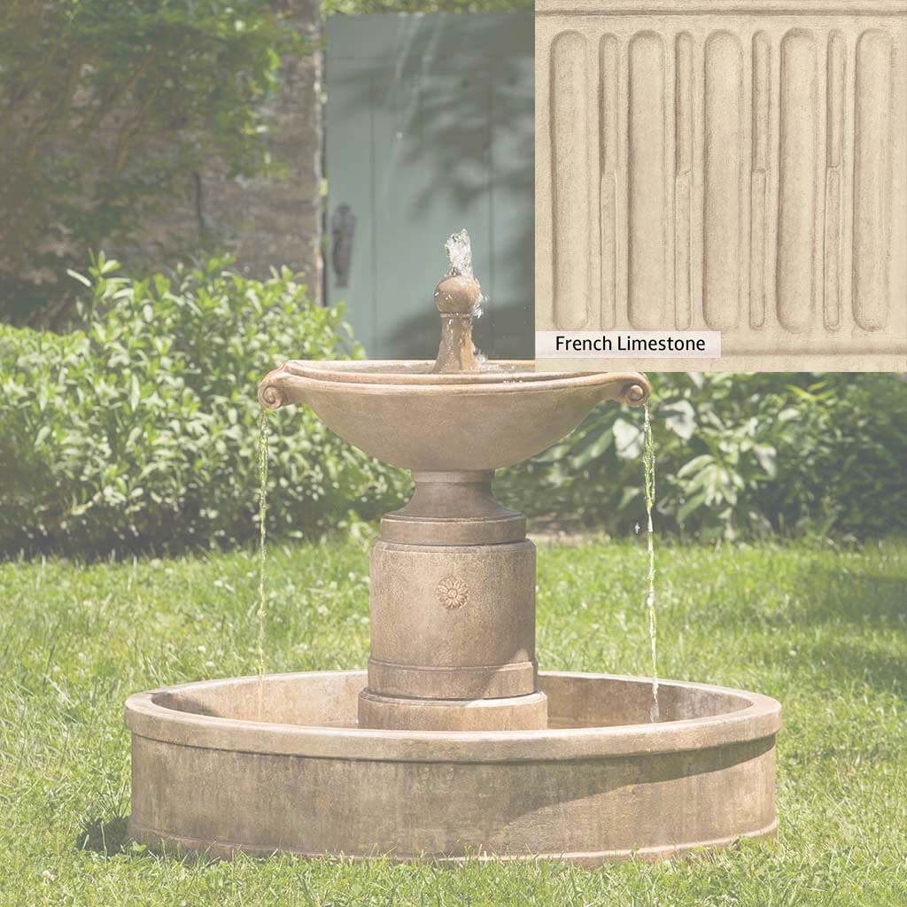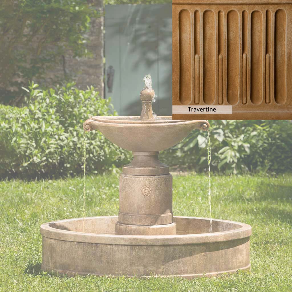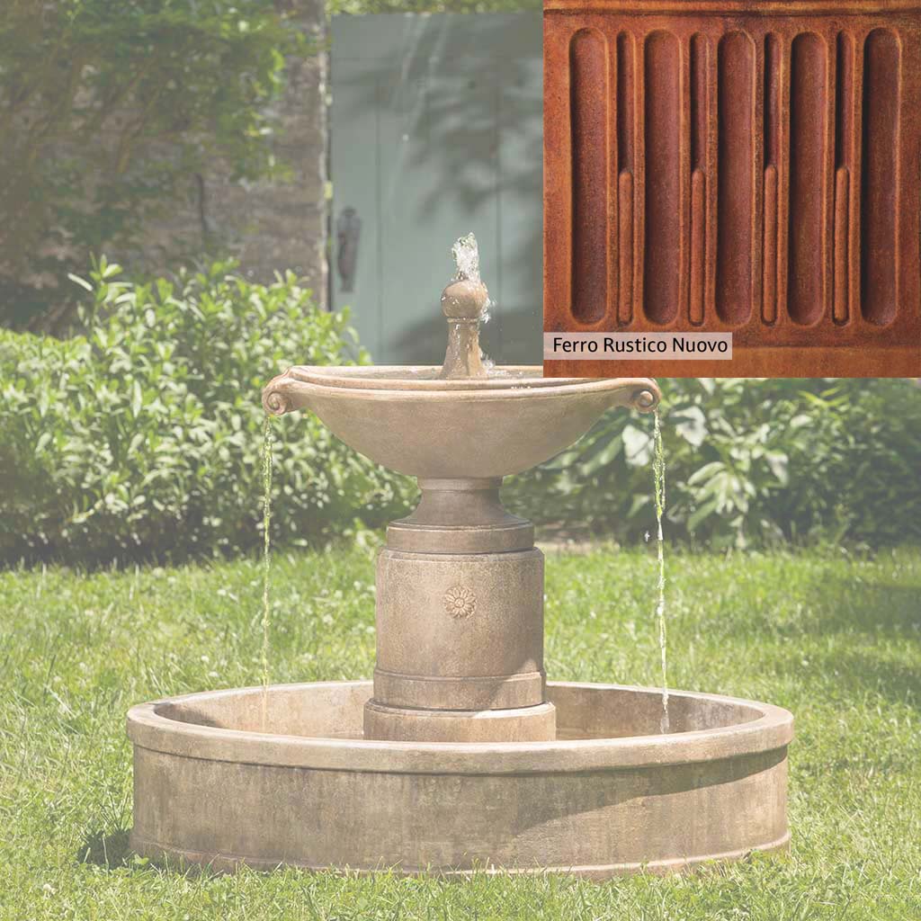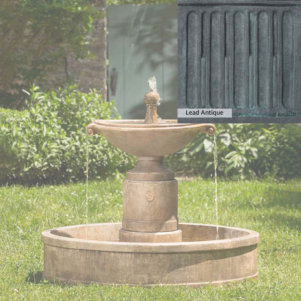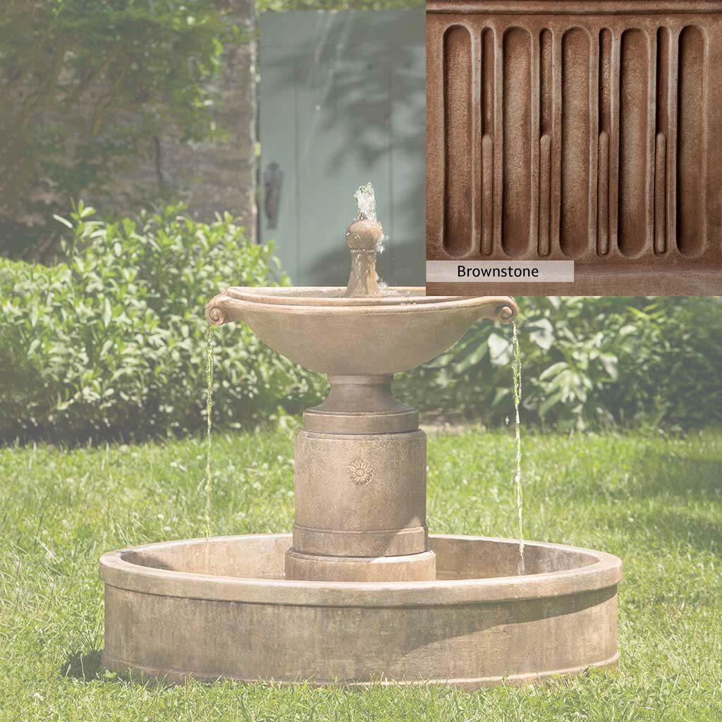 Skilled artisans in the USA handcraft the Borghese Fountain in Basin. The Campania team applies a unique patina, making each piece one-of-a-kind. This fountain is shown in the Pietra Nuova color. Due to materials, manufacturing processes, and variations in photography conditions, natural differences can occur in size, weight, and color. The actual color may vary from the photo.