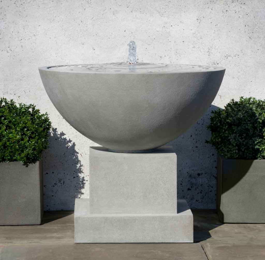 The Campania International Darien Plinth Fountain is one of the finest patio fountains. The sound of water gently bubbles from the spout and falls back into the large round bowl. Our GFRC material has high compressive strength, making it frost-proof, thaw-proof, rust-proof, and fire-proof. It meets the standards for commercial use.