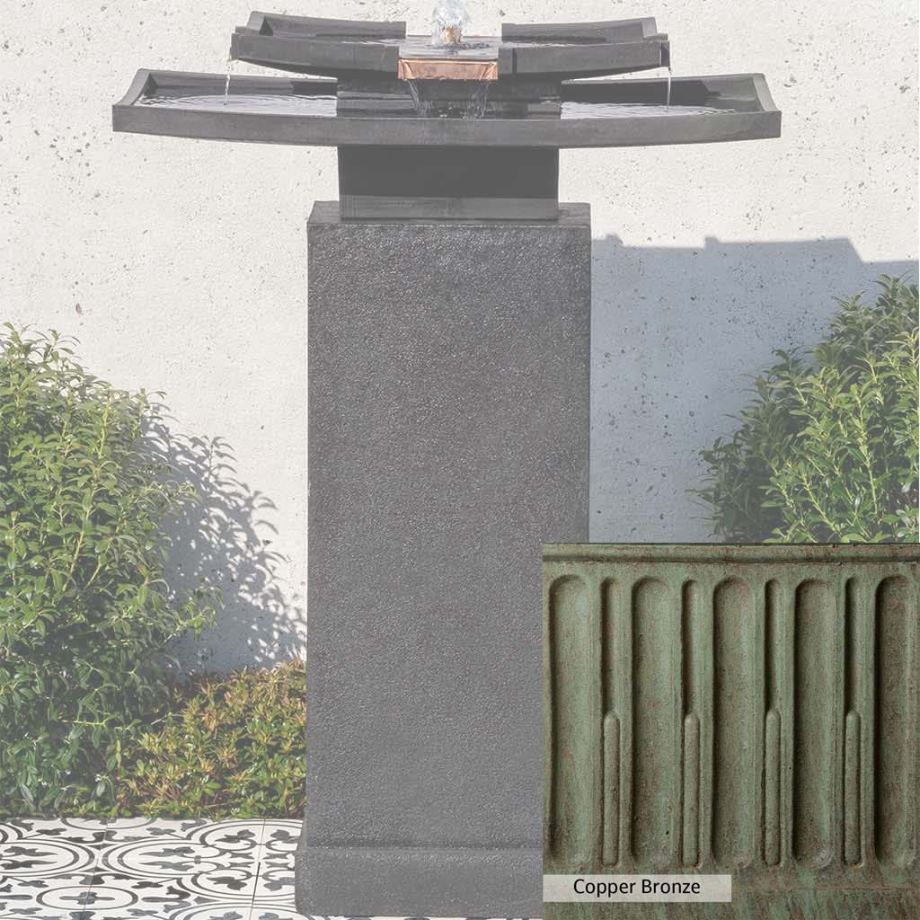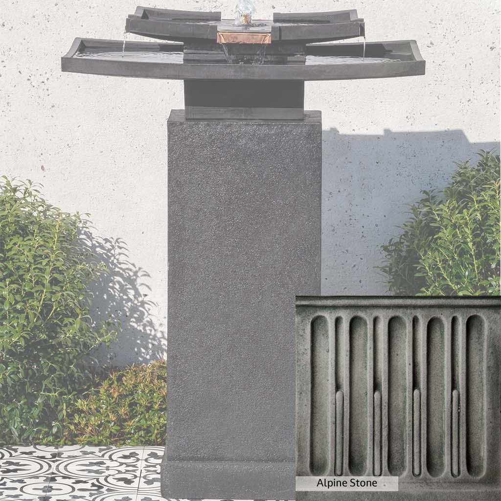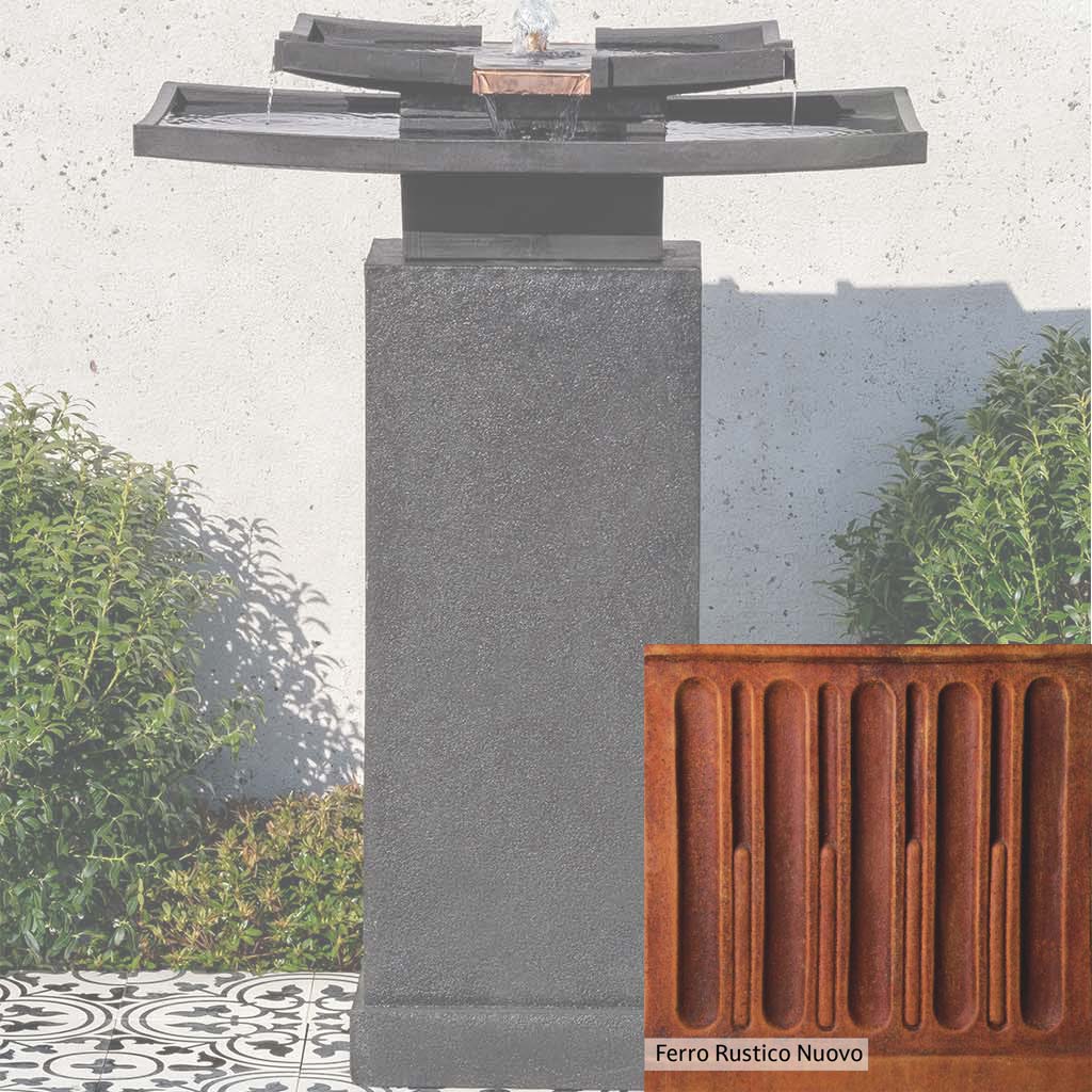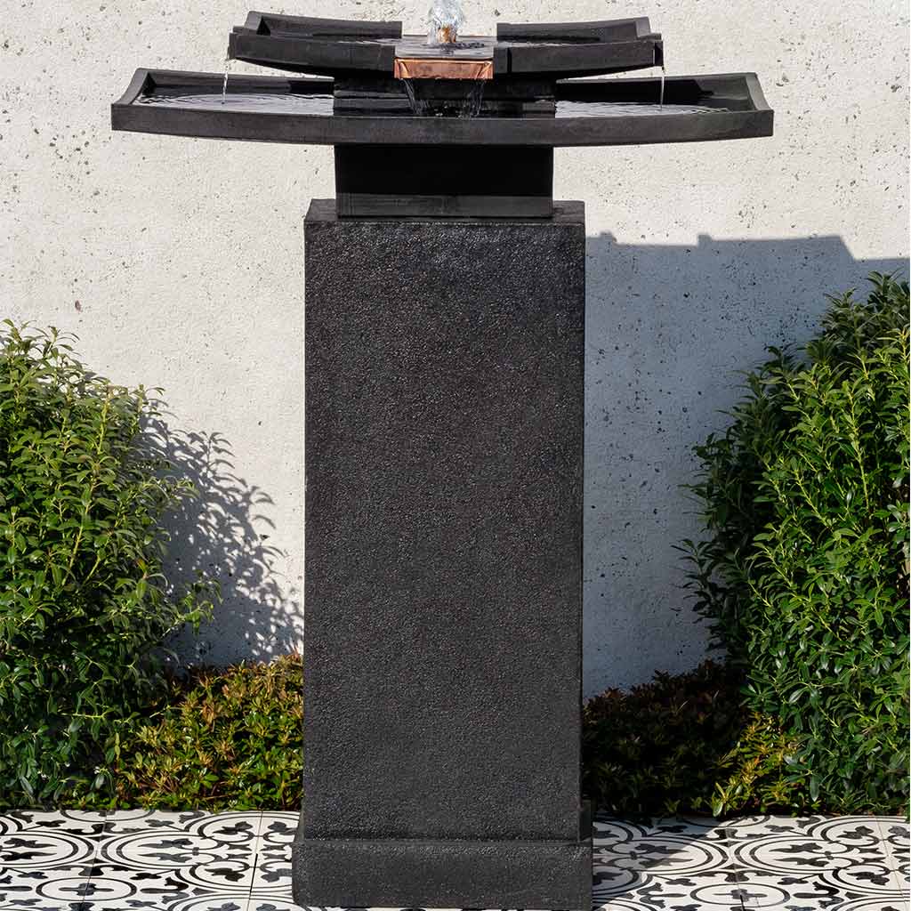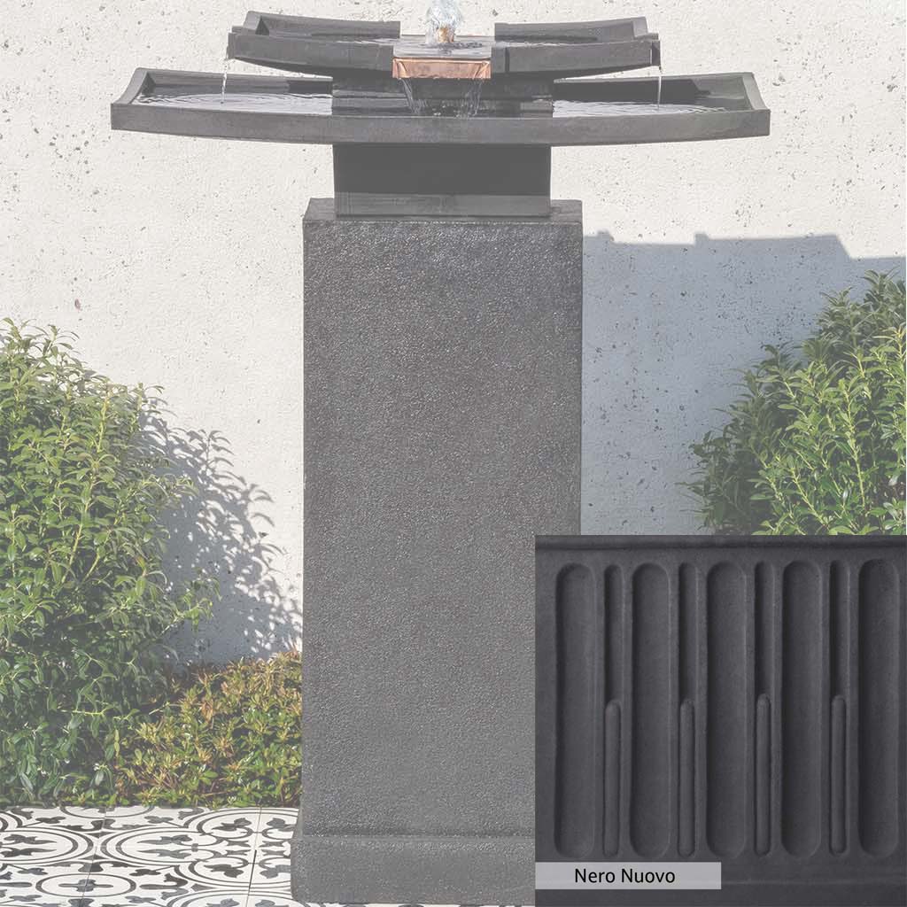 The Katsura Fountain with Pedestal is handcrafted by skilled artisans in the USA. With their extensive experience, the Campania team applies a unique patina to ensure that each piece is special. This fountain is shown in the Nero Nuovo color. Campania International's proprietary cast stone blend is meticulously molded to create each piece used in the construction of this fountain. Due to the use of different materials and manufacturing processes, as well as varying photography conditions, natural variations in size, weight, and color can occur. The actual color may differ from the photo.