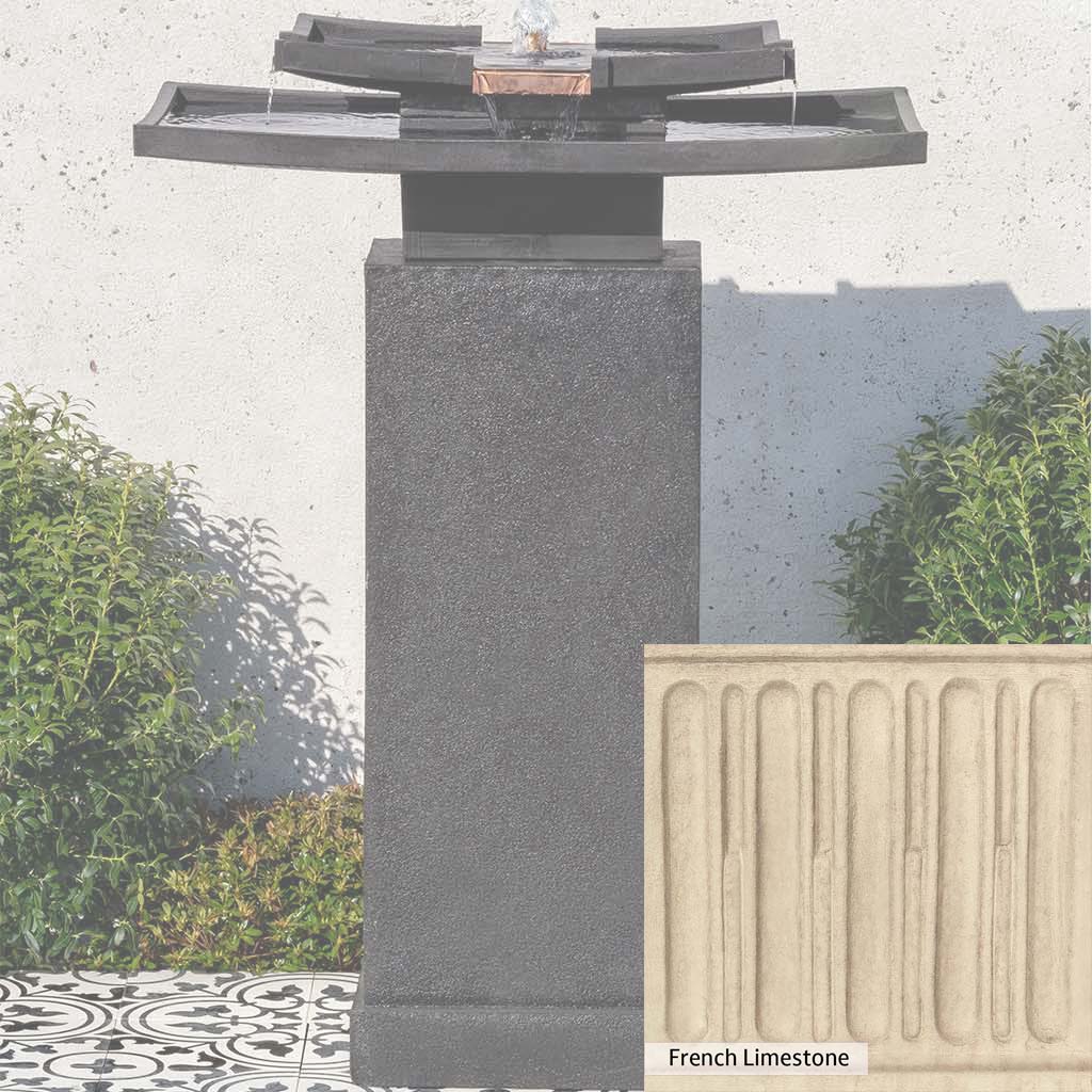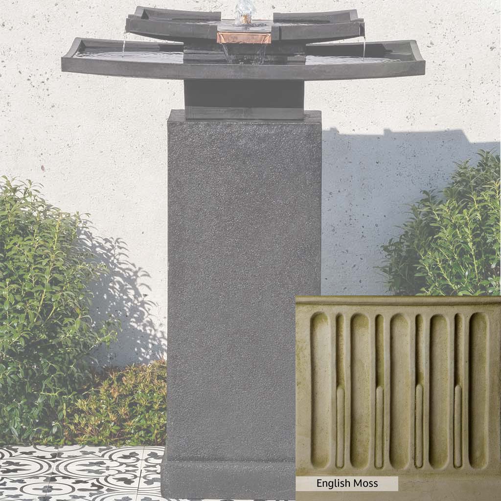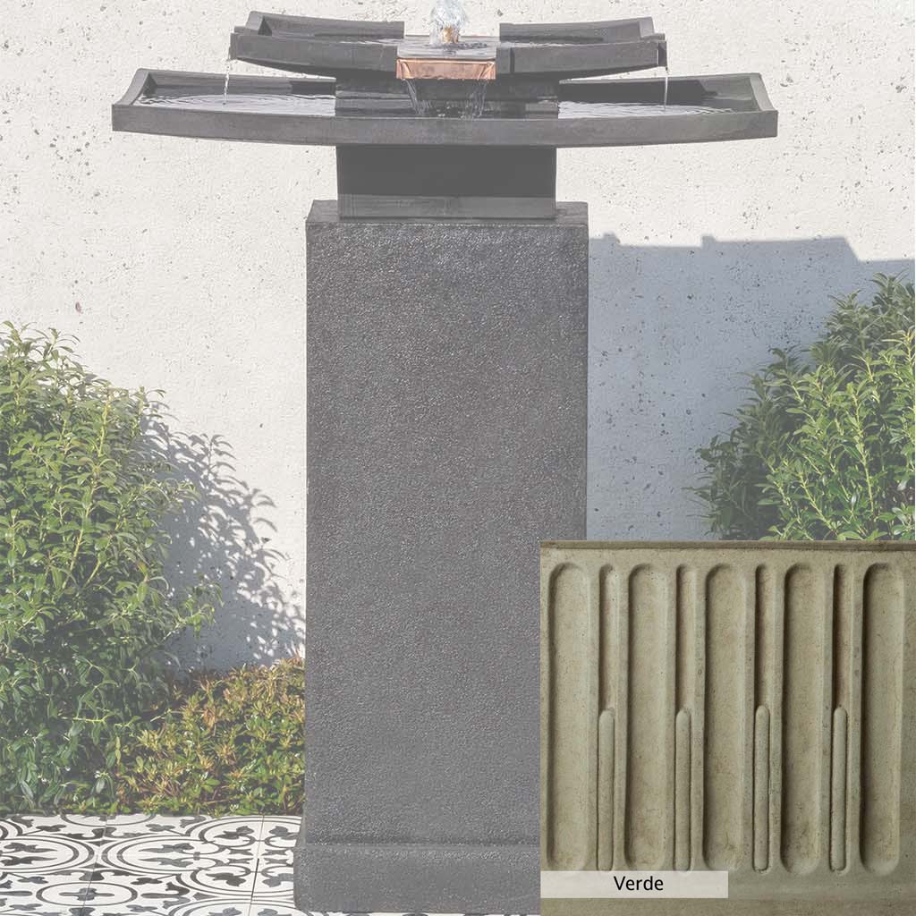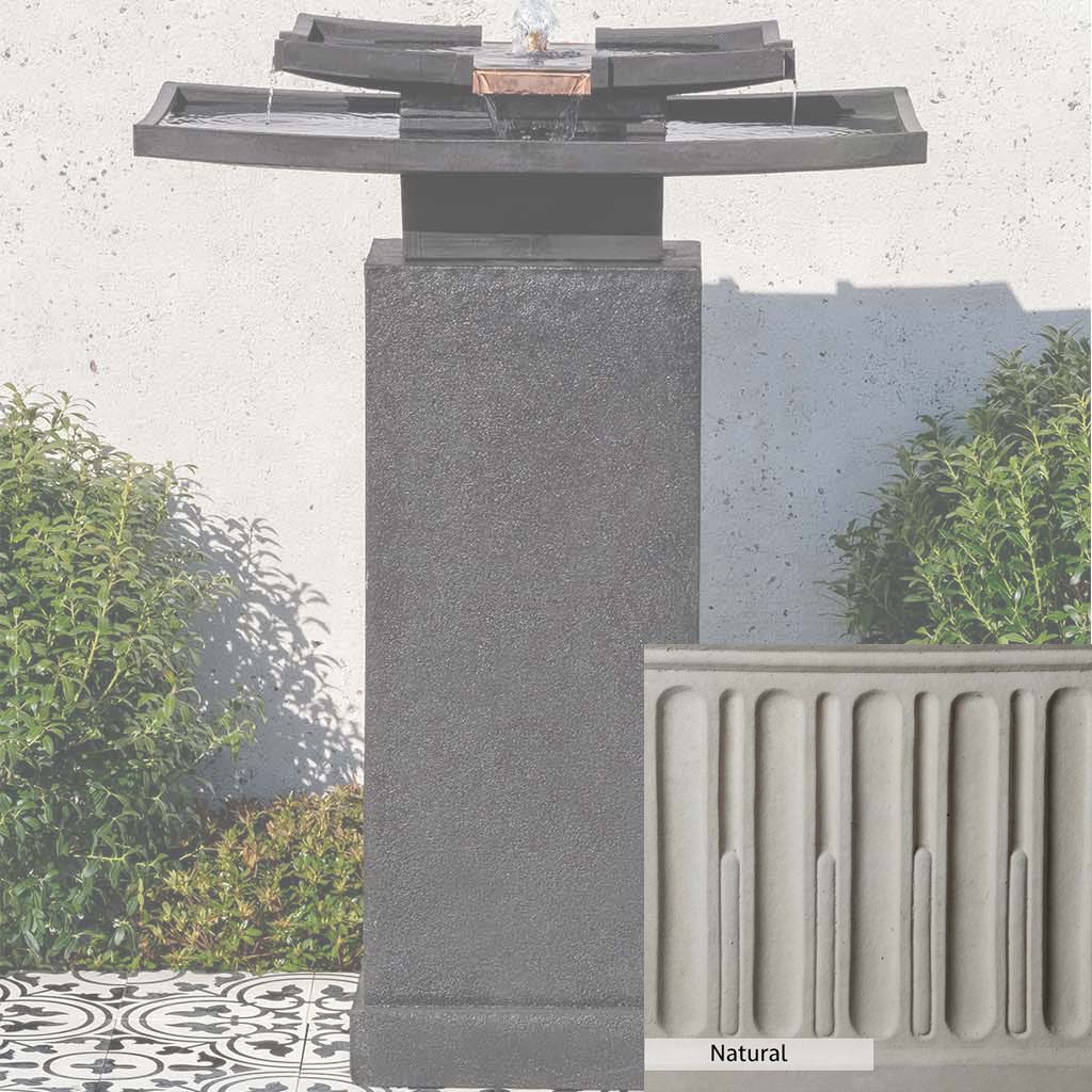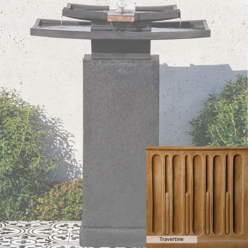 The Katsura Fountain with Pedestal is handcrafted by skilled artisans in the USA. With their extensive experience, the Campania team applies a unique patina to ensure that each piece is special. This fountain is shown in the Nero Nuovo color. Campania International's proprietary cast stone blend is meticulously molded to create each piece used in the construction of this fountain. Due to the use of different materials and manufacturing processes, as well as varying photography conditions, natural variations in size, weight, and color can occur. The actual color may differ from the photo.