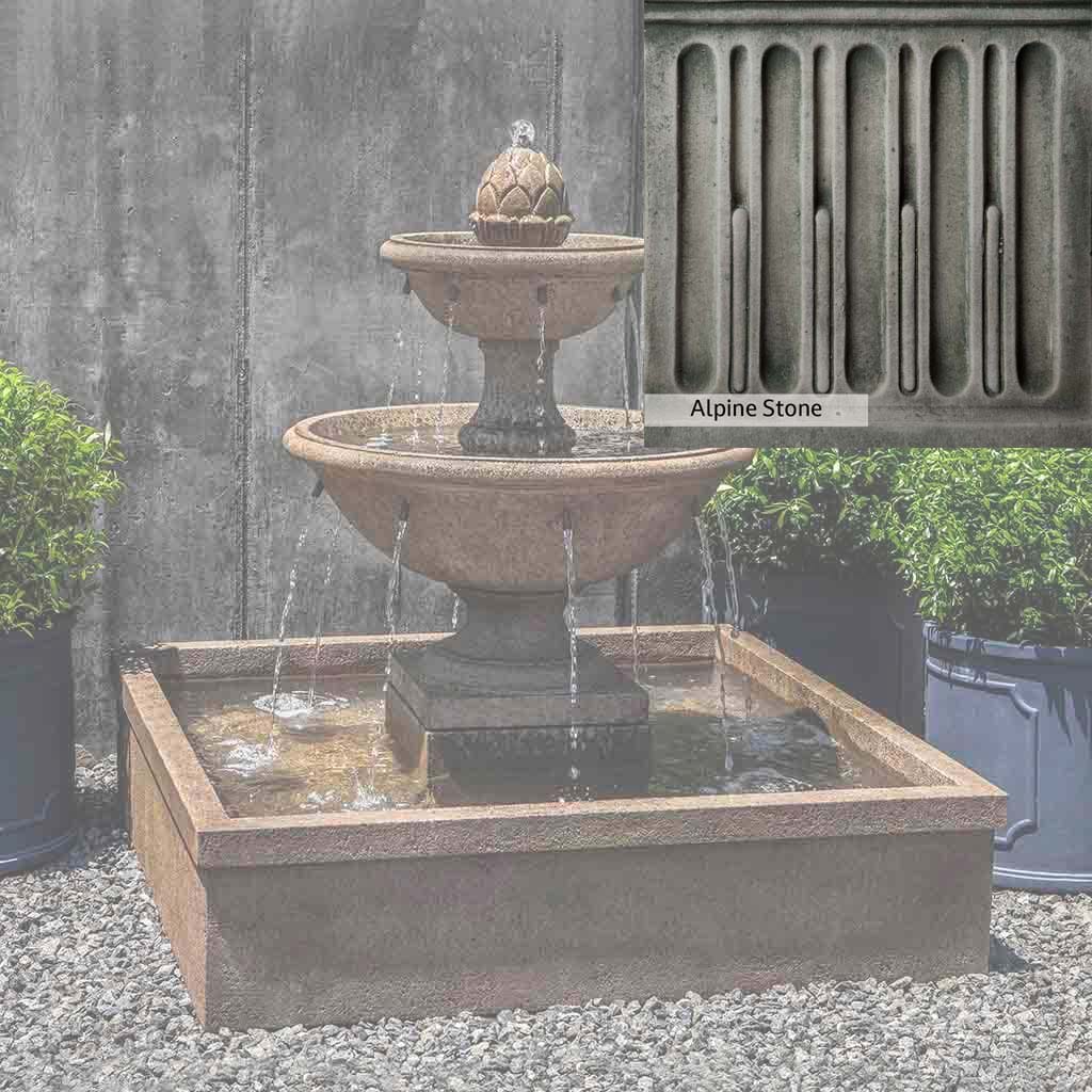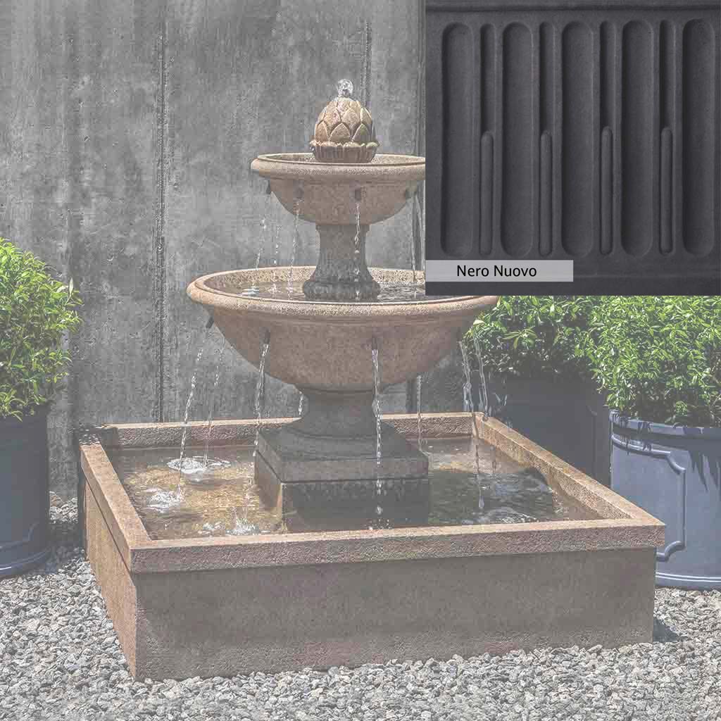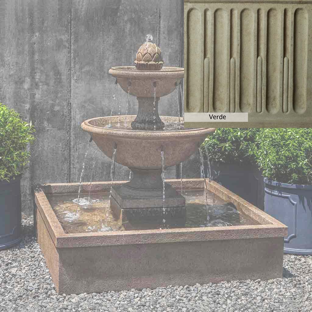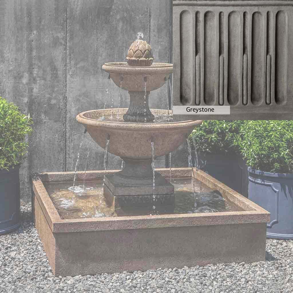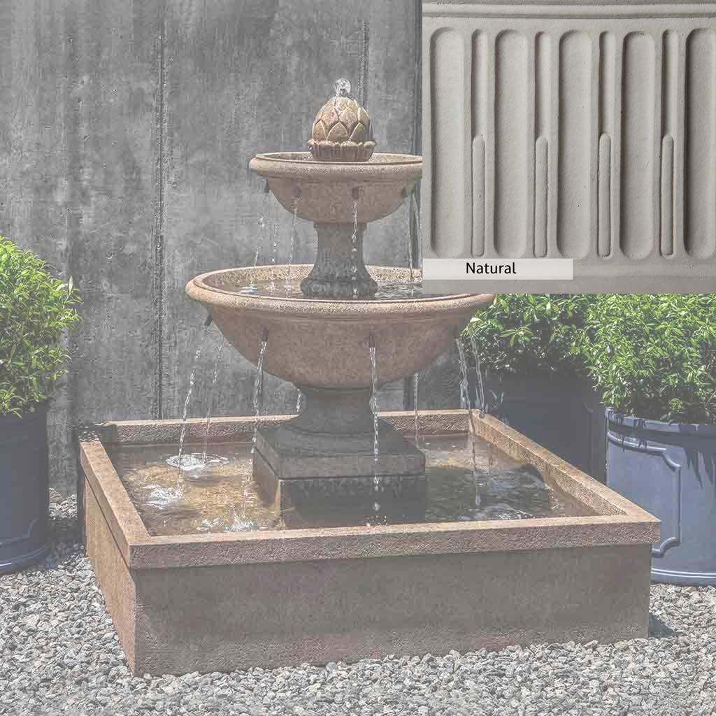 Skilled artisans in the USA handcraft the La Mirande Fountain. The Campania team applies a unique patina, making each piece one-of-a-kind. This fountain is shown in the Aged Limestone color. Due to materials, manufacturing processes, and variations in photography conditions, natural differences can occur in size, weight, and color. The actual color may vary from the photo.