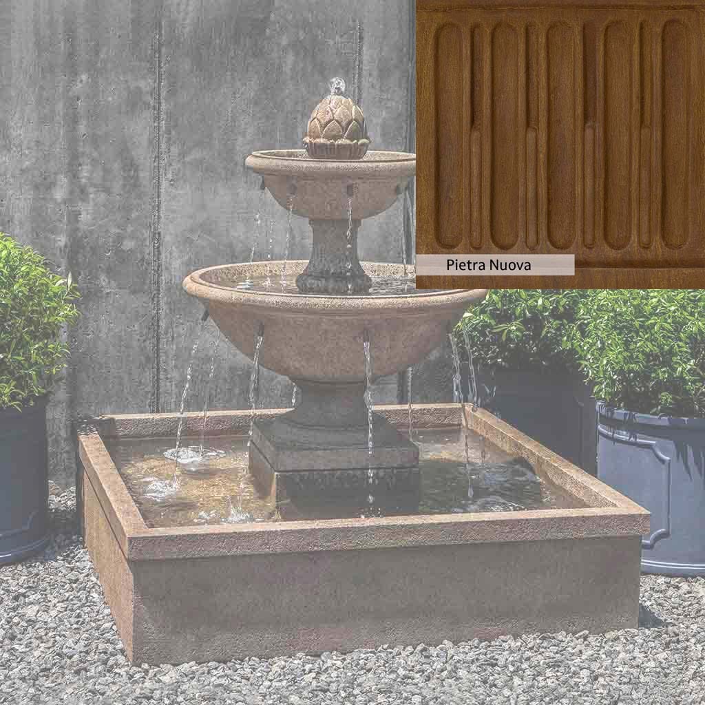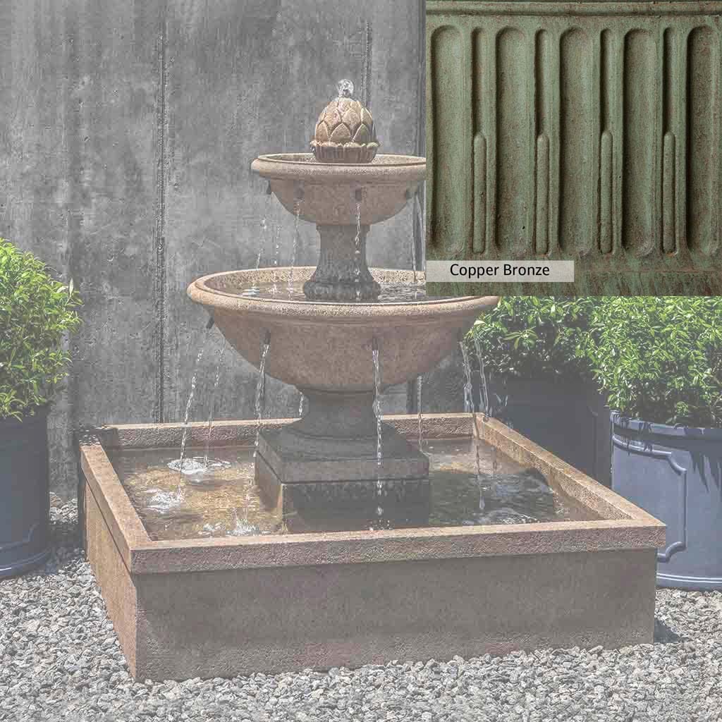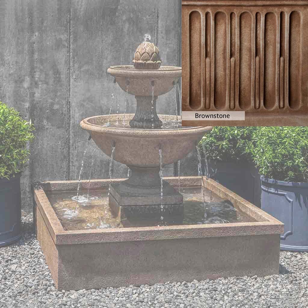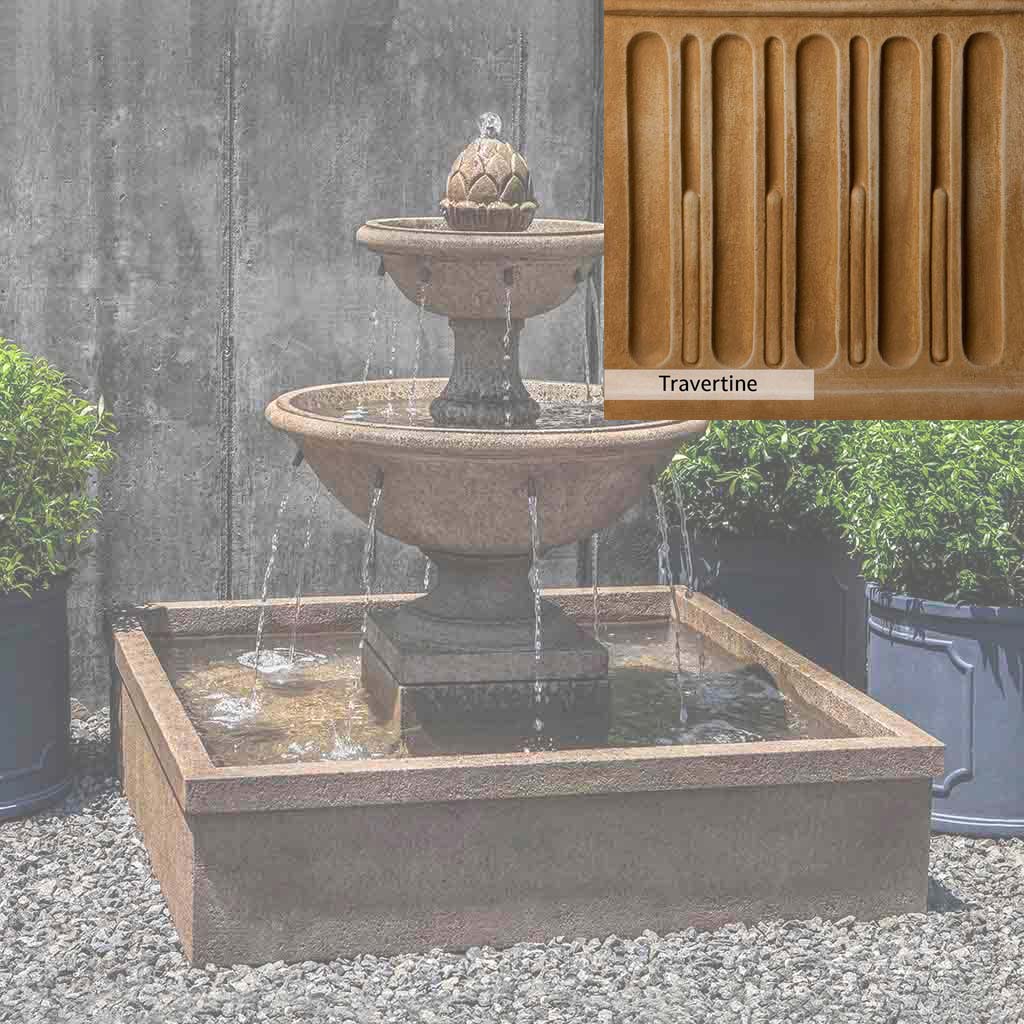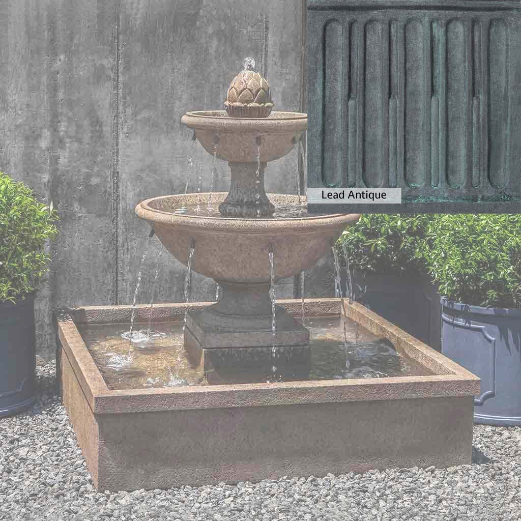Skilled artisans in the USA handcraft the La Mirande Fountain. The Campania team applies a unique patina, making each piece one-of-a-kind. This fountain is shown in the Aged Limestone color. Due to materials, manufacturing processes, and variations in photography conditions, natural differences can occur in size, weight, and color. The actual color may vary from the photo.