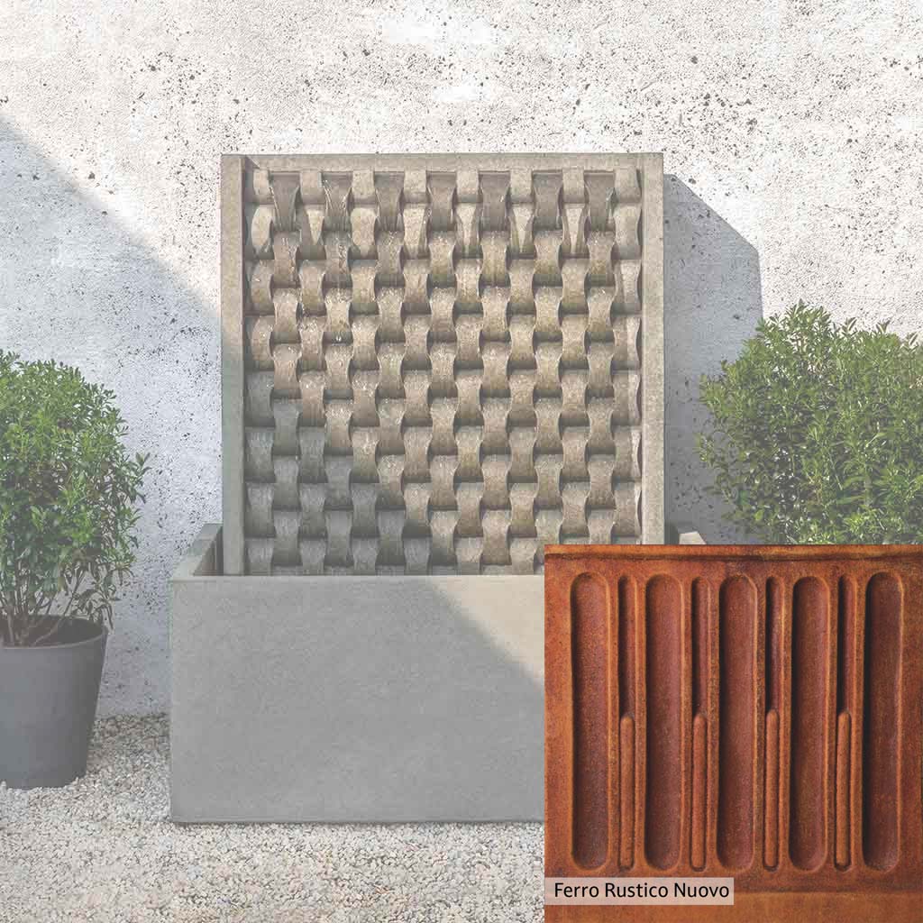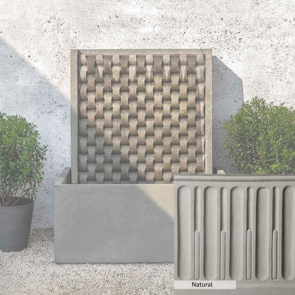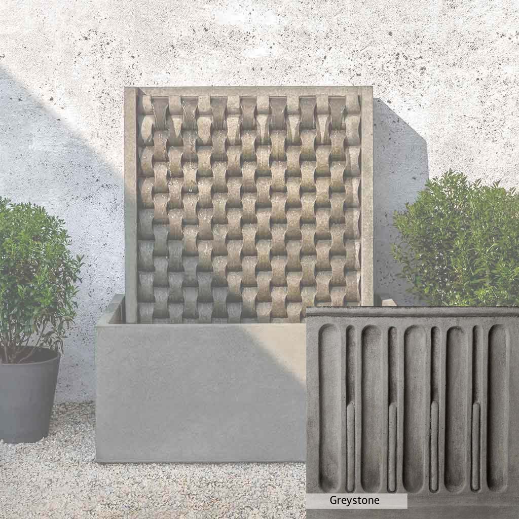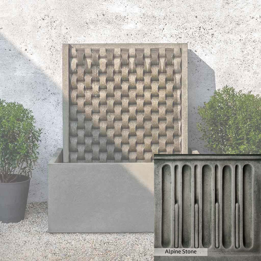 The Large M Weave Fountain is handcrafted by skilled artisans in the USA. With their extensive experience, the Campania team applies a unique patina to ensure that each piece is special. This fountain is shown in the Alpine Stone color. Campania International's proprietary cast stone blend is meticulously molded to create each piece used in the construction of this fountain. Due to the use of different materials and manufacturing processes, as well as varying photography conditions, natural variations in size, weight, and color can occur. The actual color may differ from the photo.