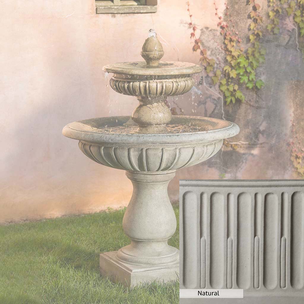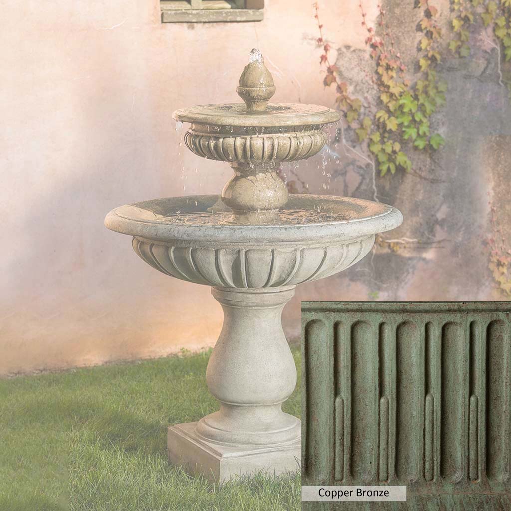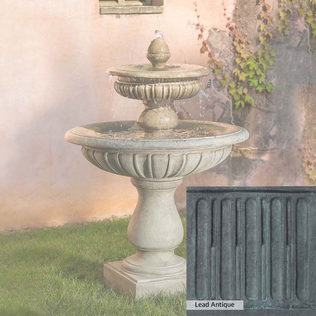The Longvue Fountain is handcrafted by skilled artisans in the USA. The Campania team applies the unique patina with experienced hands, making each piece special. This fountain is featured in the Alpine Stone color. Campania International's exclusive cast stone blend is expertly molded to create each piece in the construction of this fountain. Due to the materials used and manufacturing processes, as well as variations in photography conditions, natural differences may occur in size, weight, and color. The actual color may vary from the photo.
