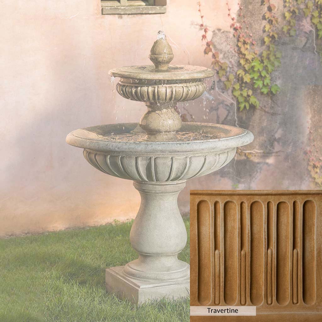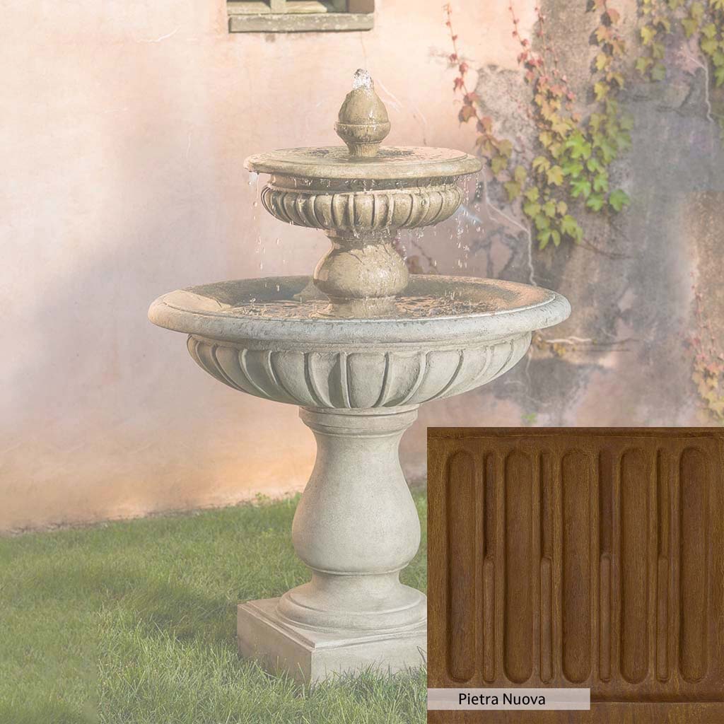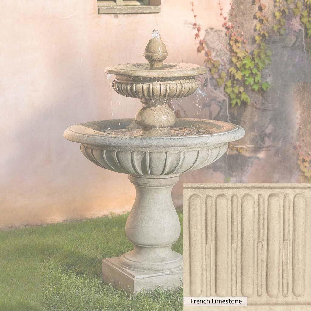 The Longvue Fountain is handcrafted by skilled artisans in the USA. The Campania team applies the unique patina with experienced hands, making each piece special. This fountain is featured in the Alpine Stone color. Campania International's exclusive cast stone blend is expertly molded to create each piece in the construction of this fountain. Due to the materials used and manufacturing processes, as well as variations in photography conditions, natural differences may occur in size, weight, and color. The actual color may vary from the photo.