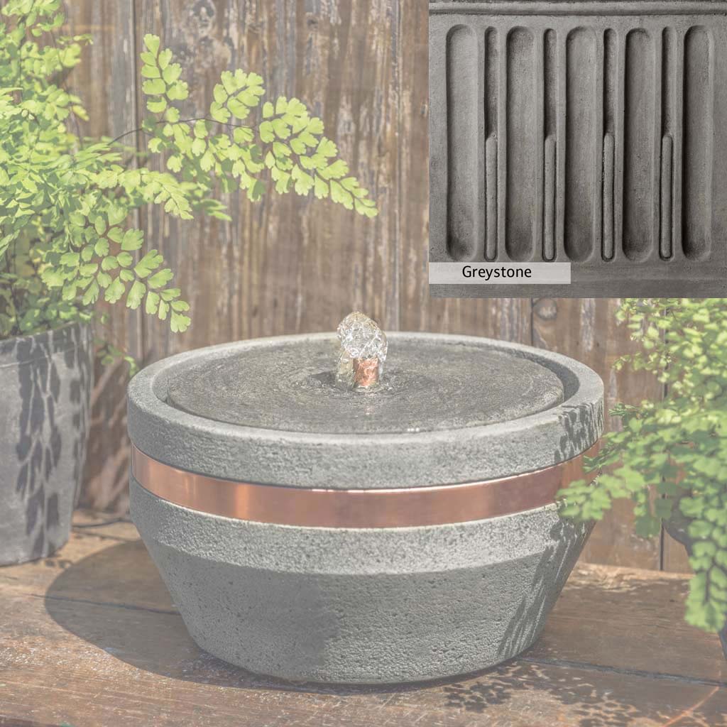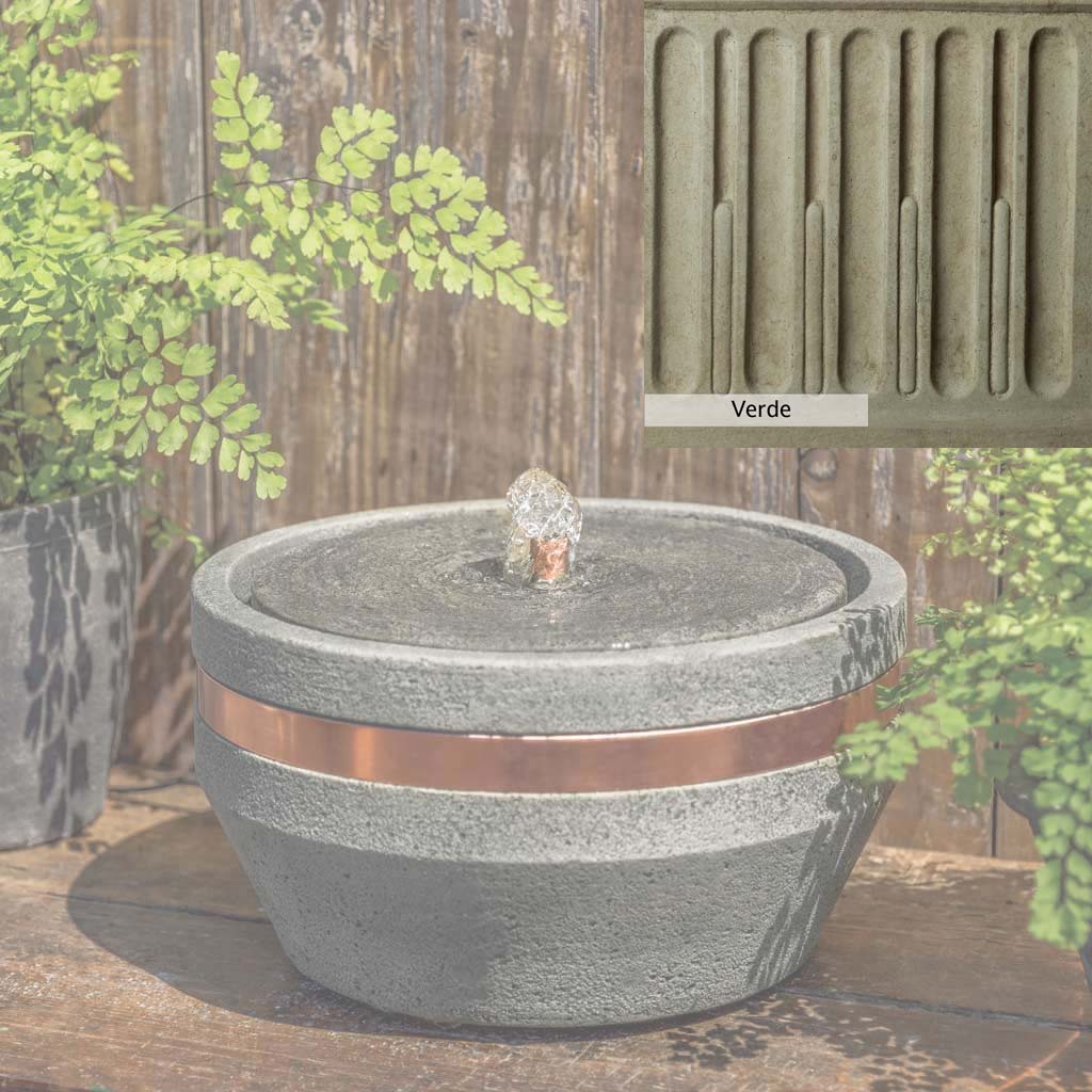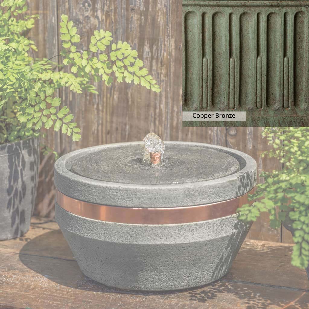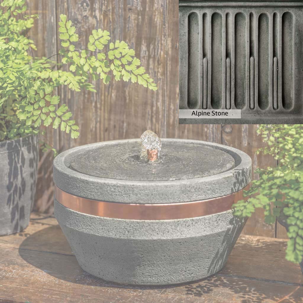 Skilled artisans in the USA handcraft the M-Series Bevel Fountain. The Campania team applies a unique patina, making each piece one-of-a-kind. This fountain is shown in the Alpine Stone color. Due to materials, manufacturing processes, and variations in photography conditions, natural differences can occur in size, weight, and color. The actual color may vary from the photo.