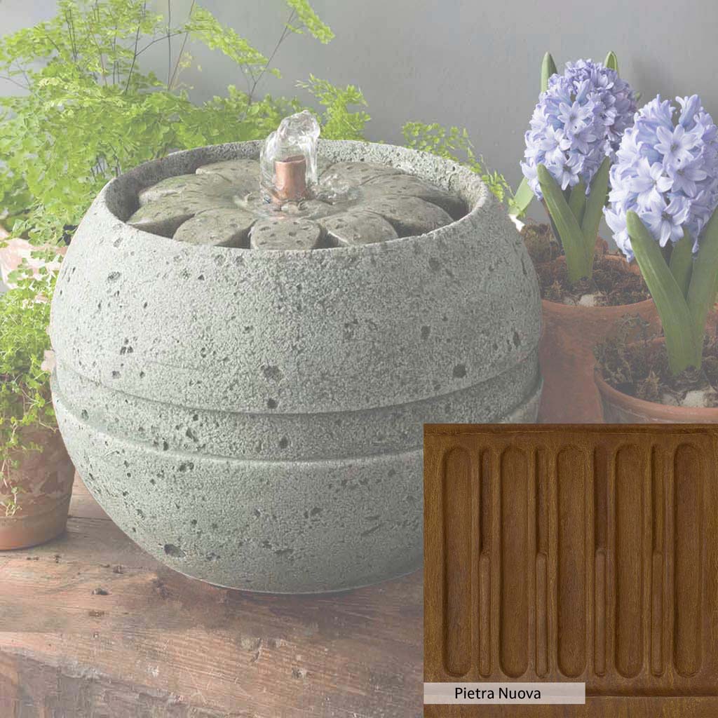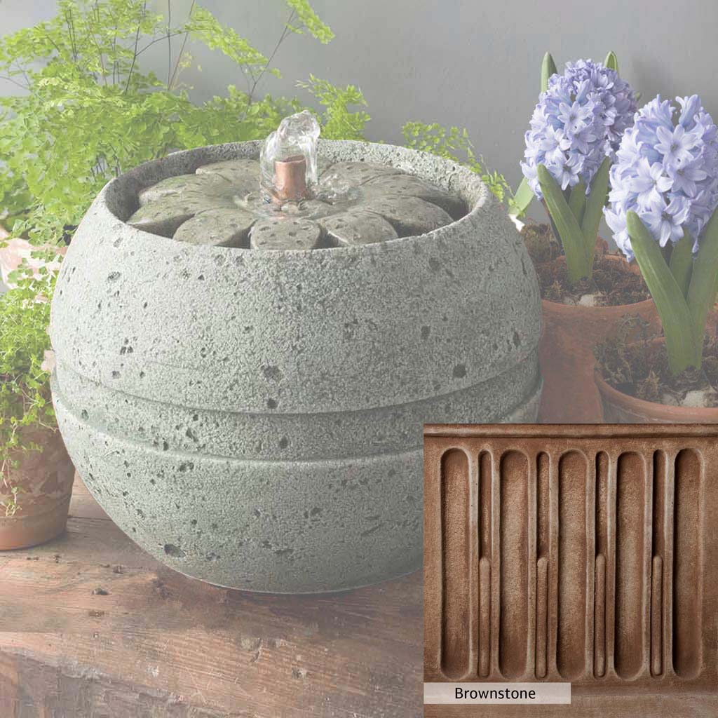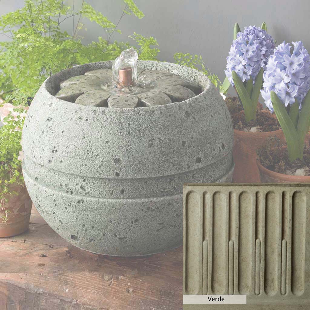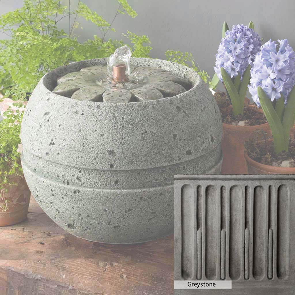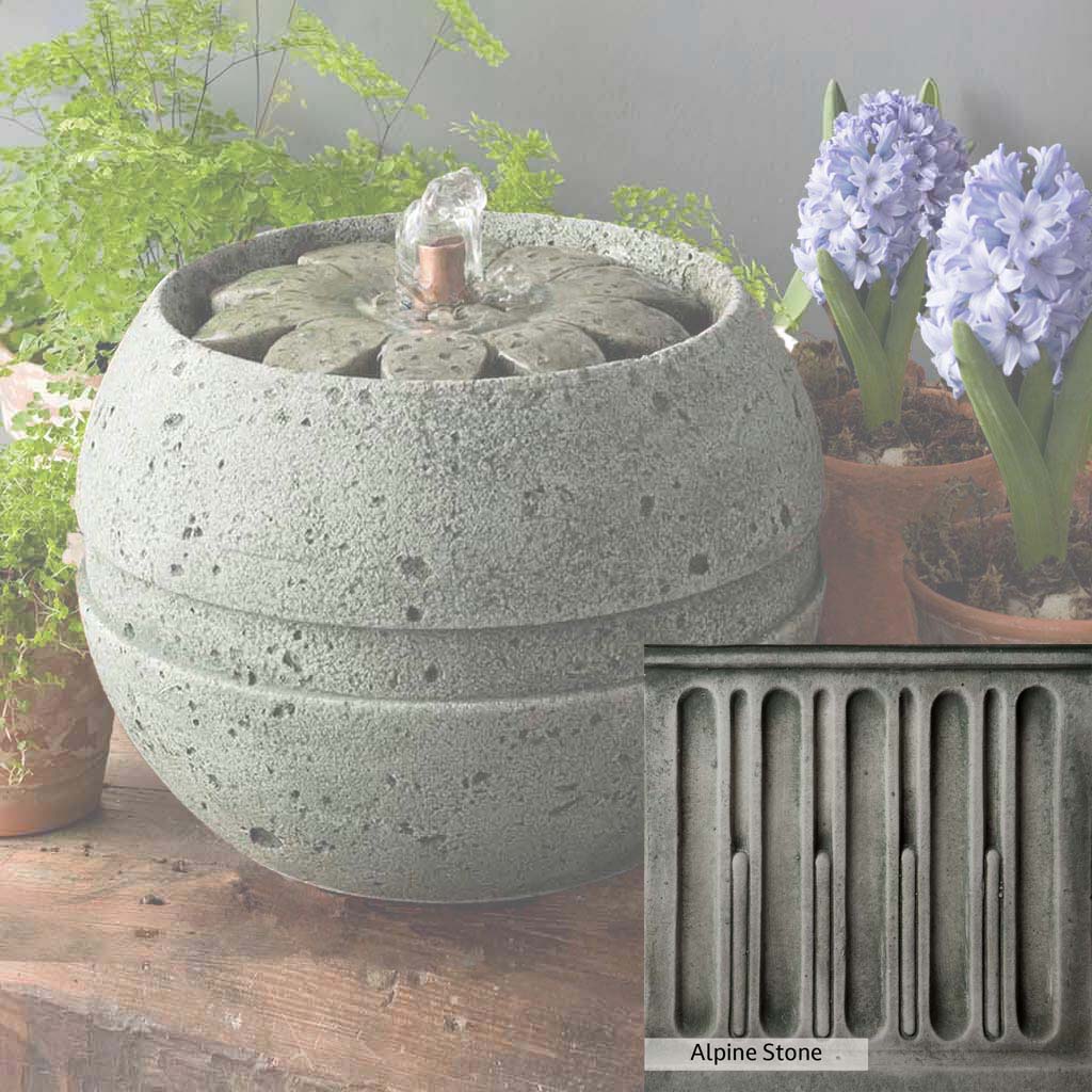 The M-Series Rosette Fountain is handcrafted by skilled artisans in the USA. The Campania team applies a unique patina with experienced hands, making each piece special. This fountain is featured in the Alpine Stone color. Campania International's exclusive cast stone blend is expertly molded to create each piece in the construction of this fountain. Due to the materials used and manufacturing processes, as well as variations in photography conditions, natural differences may occur in size, weight, and color. The actual color may vary from the photo.