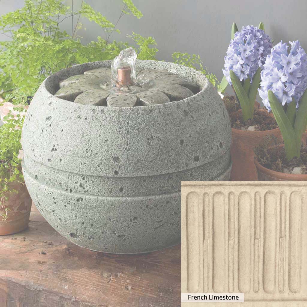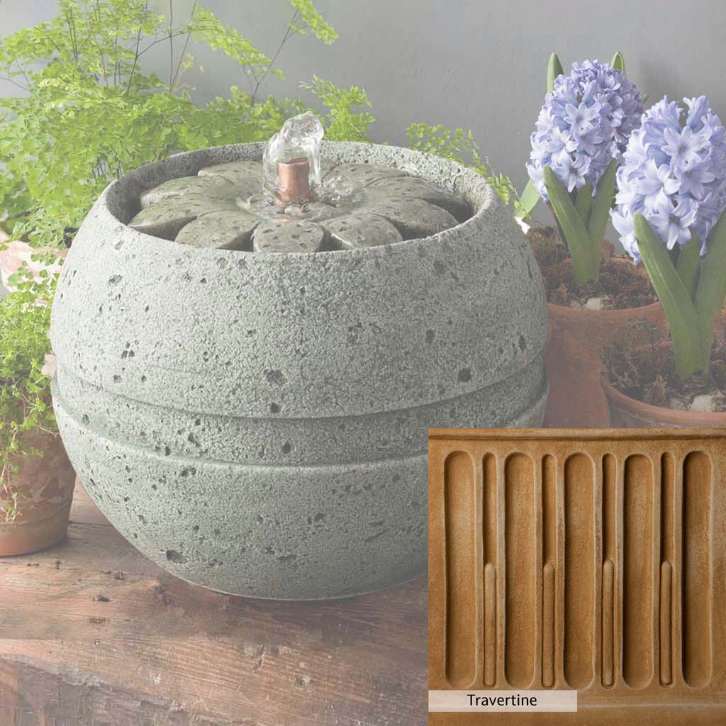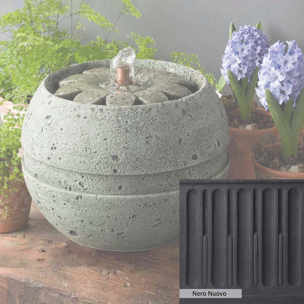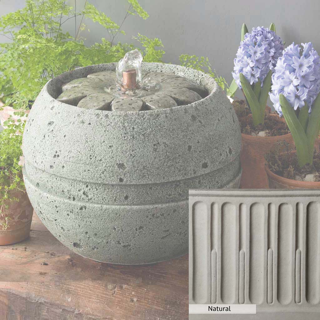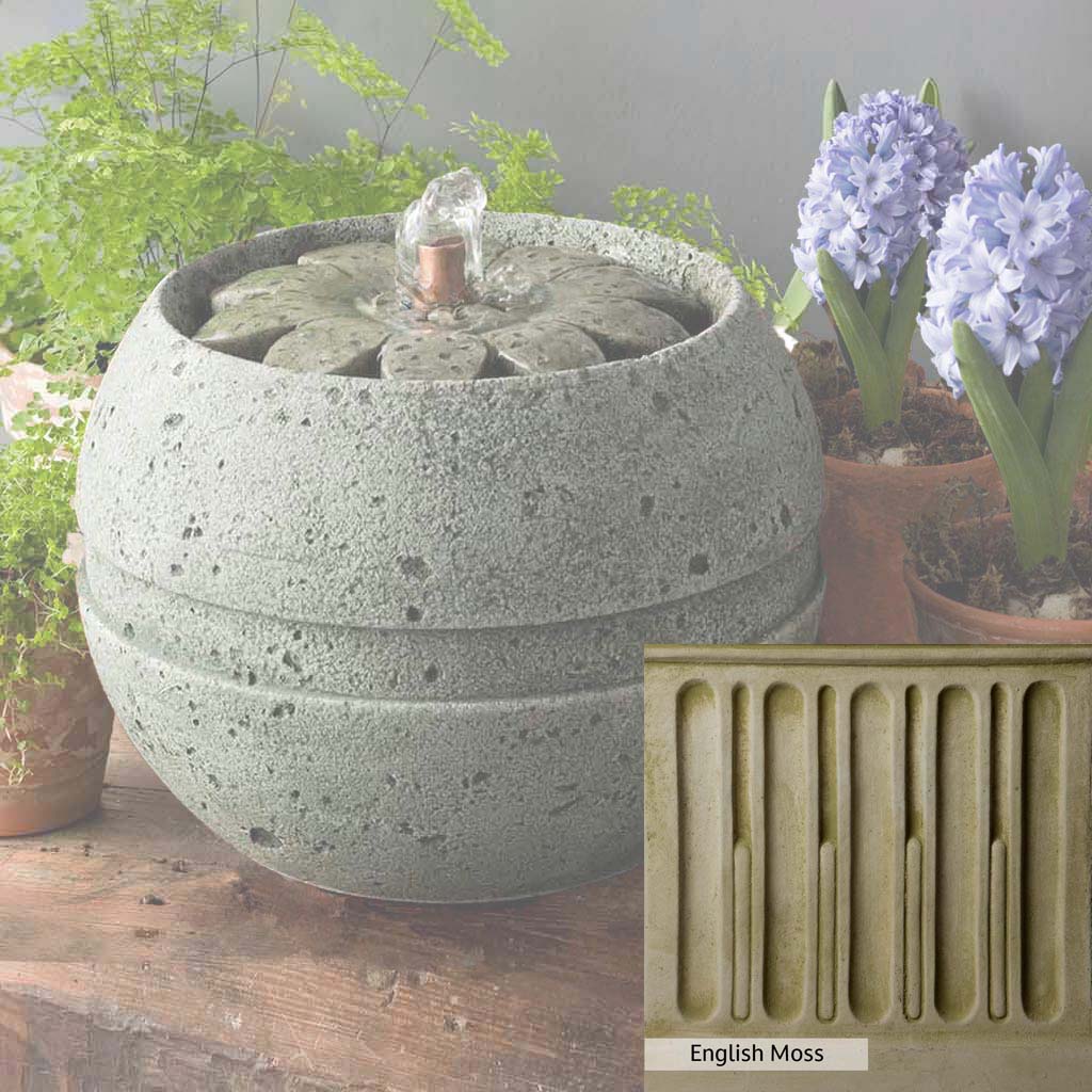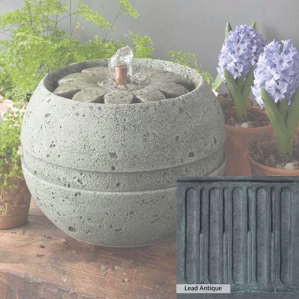 The M-Series Rosette Fountain is handcrafted by skilled artisans in the USA. The Campania team applies a unique patina with experienced hands, making each piece special. This fountain is featured in the Alpine Stone color. Campania International's exclusive cast stone blend is expertly molded to create each piece in the construction of this fountain. Due to the materials used and manufacturing processes, as well as variations in photography conditions, natural differences may occur in size, weight, and color. The actual color may vary from the photo.