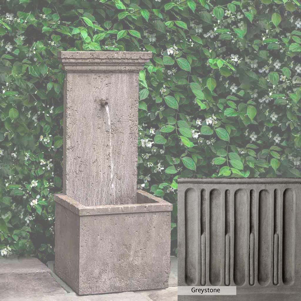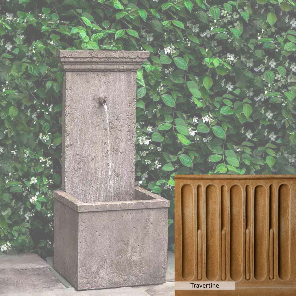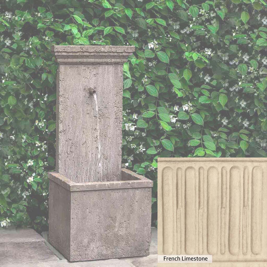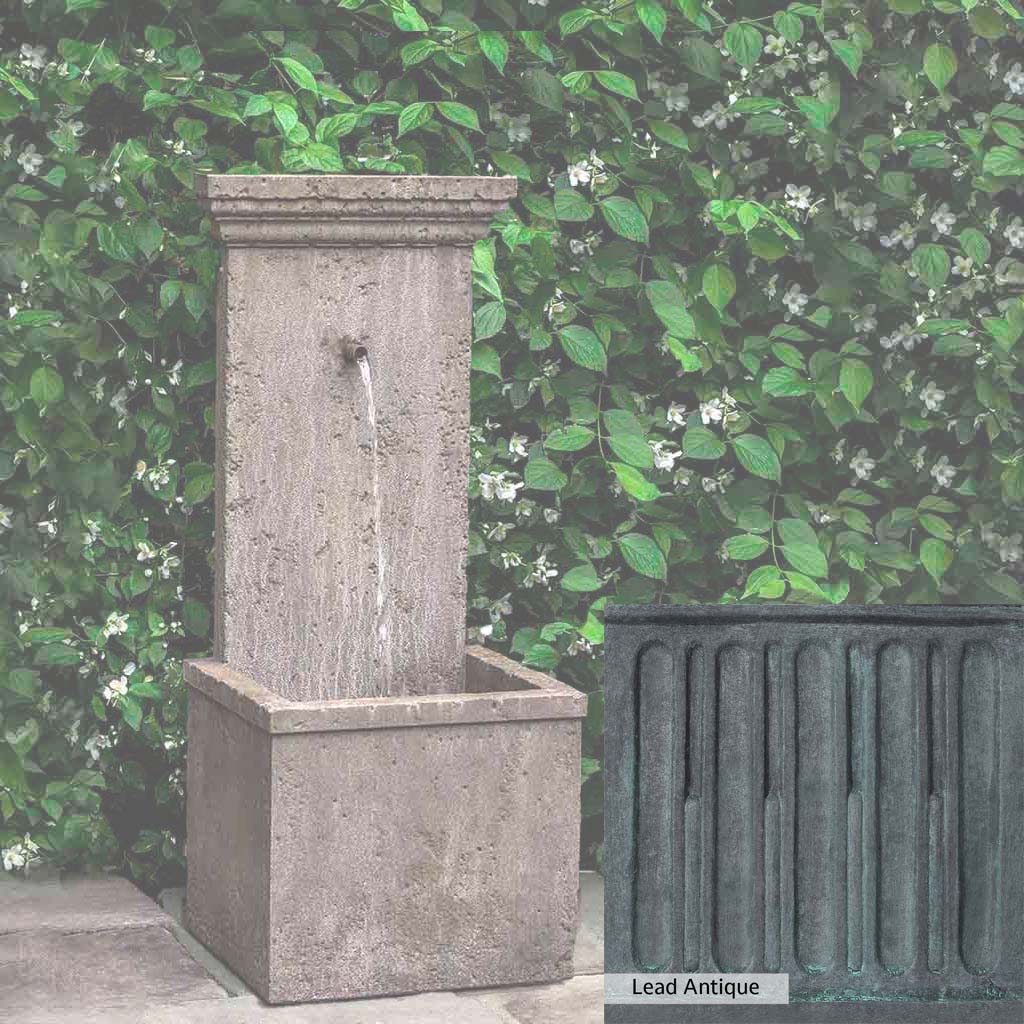 The Marais Wall Fountain is handcrafted by skilled artisans in the USA. The Campania team applies the unique patina with experienced hands, making each piece special. This fountain is featured in the Aged Limestone color. Campania International's exclusive cast stone blend is expertly molded to create each piece in the construction of this fountain. Due to the materials used and manufacturing processes, as well as variations in photography conditions, natural differences may occur in size, weight, and color. The actual color may vary from the photo.