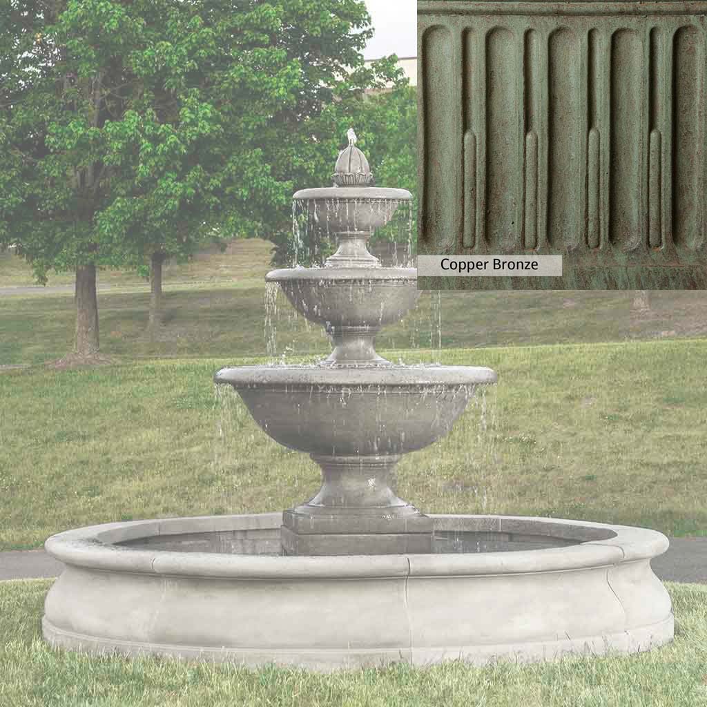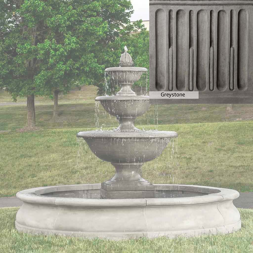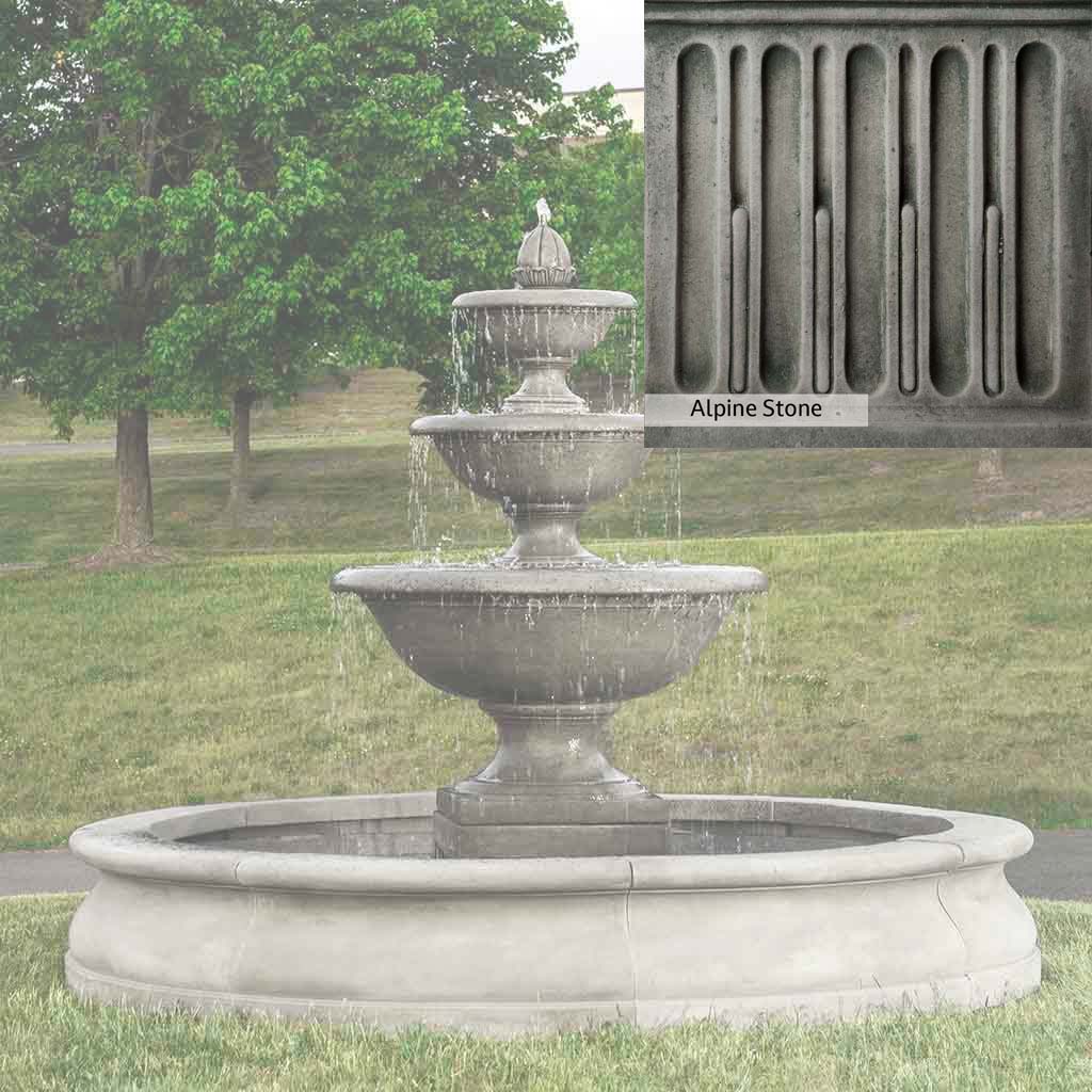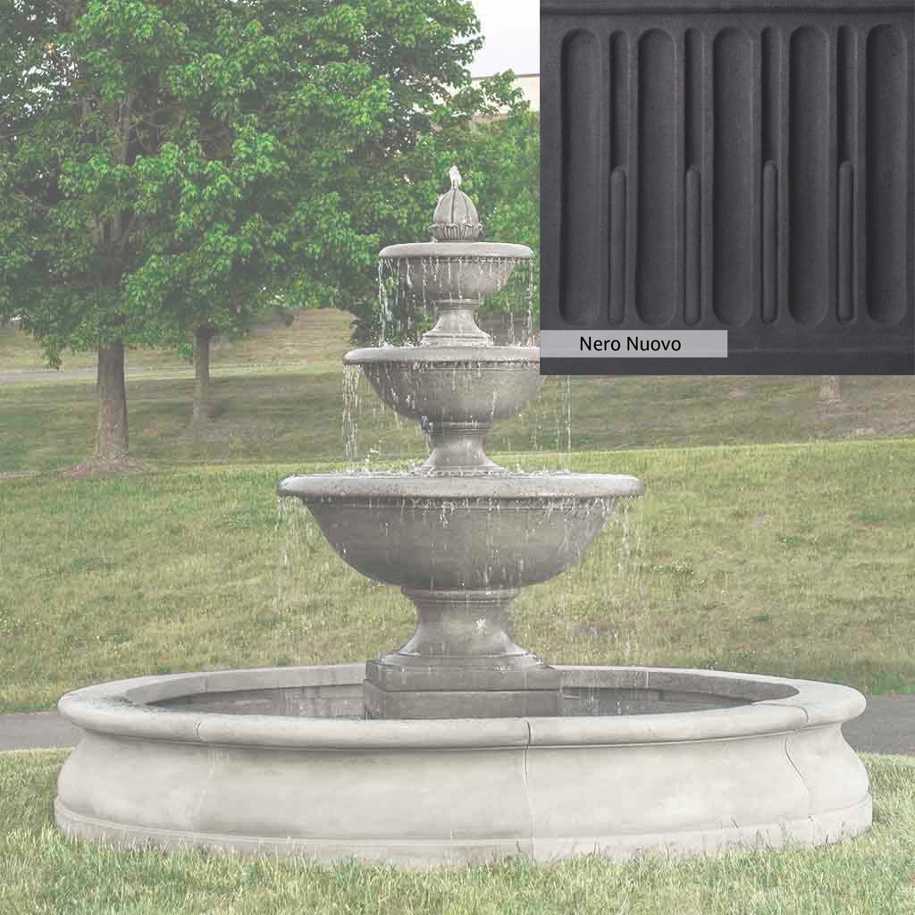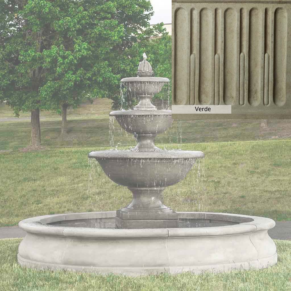 The Monteros Fountain in Basin is handcrafted by skilled artisans in the USA. The Campania team applies a unique patina with experienced hands, making each piece special. This fountain is featured in the color. Campania International's exclusive cast stone blend is expertly molded to create each piece in the construction of this fountain. Due to the materials used and manufacturing processes, as well as variations in photography conditions, natural differences may occur in size, weight, and color. The actual color may vary from the photo.