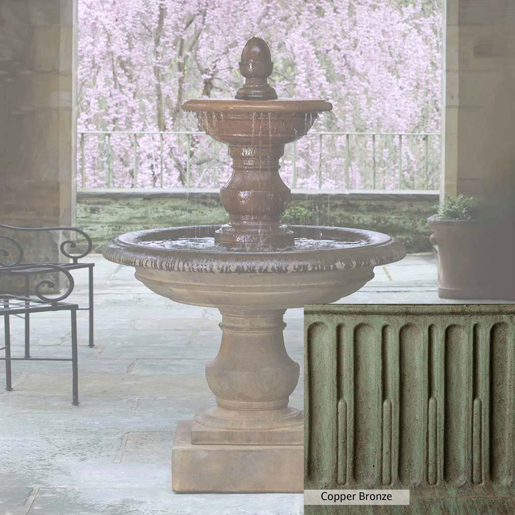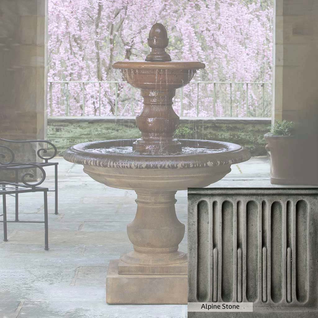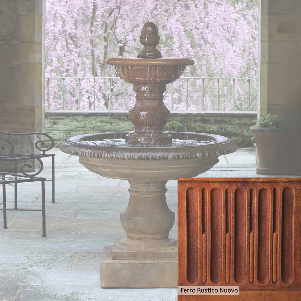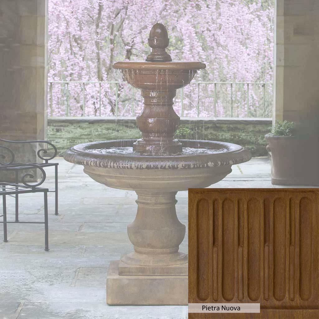 Skilled artisans in the USA handcraft the San Pietro Fountain. The Campania team applies the unique patina using their experience, making each piece one-of-a-kind. This fountain is shown in the Pietra Nuova color. Campania International's unique cast stone blend is meticulously molded to create each piece used in the construction of this fountain. Due to the materials, manufacturing processes, and variations in photography conditions, natural differences can occur in size, weight, and color. The actual color may vary from the photo.