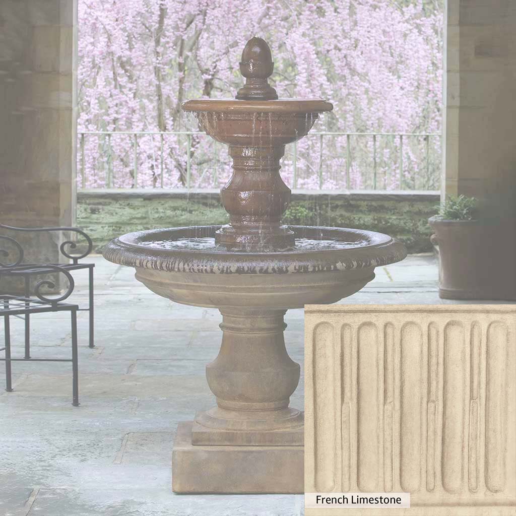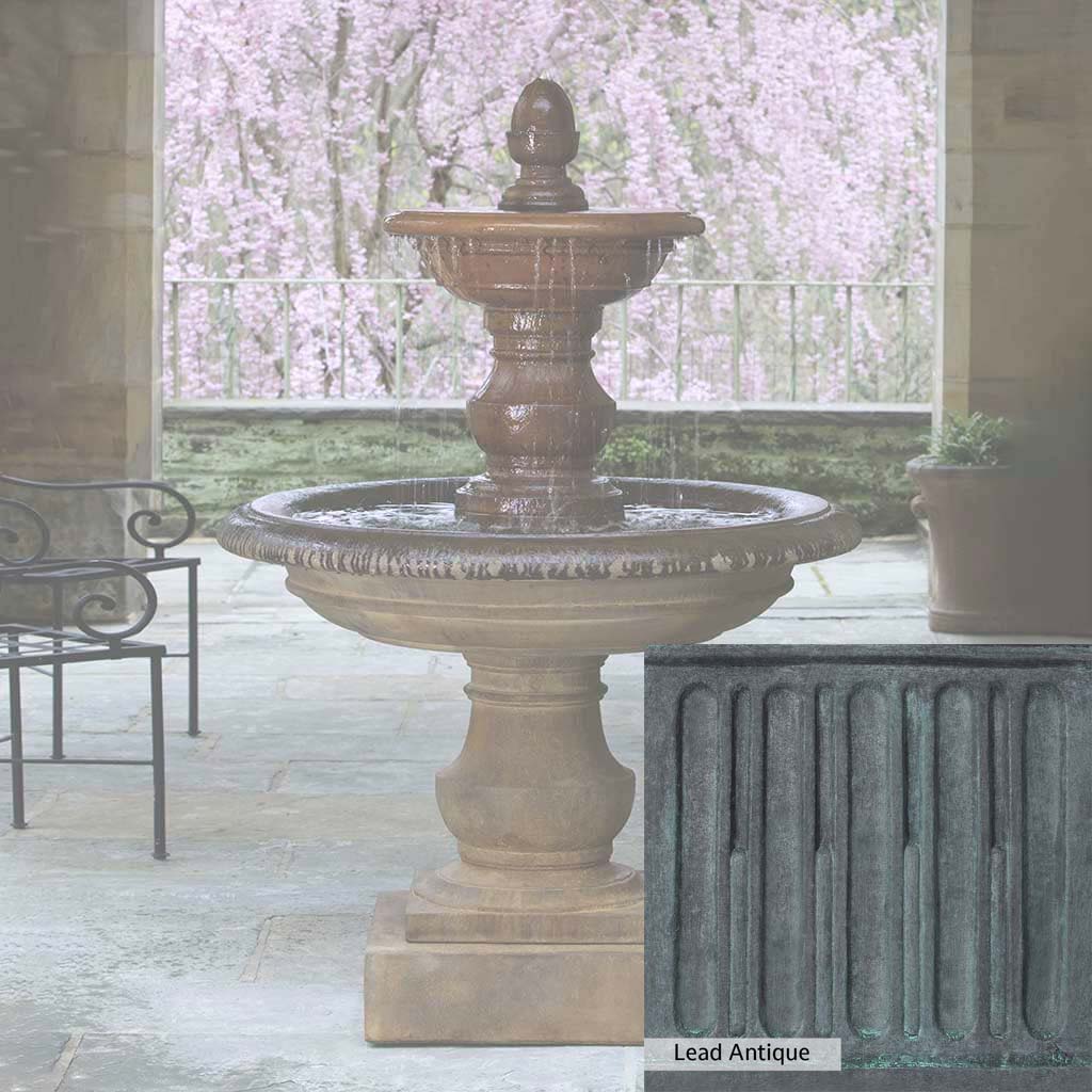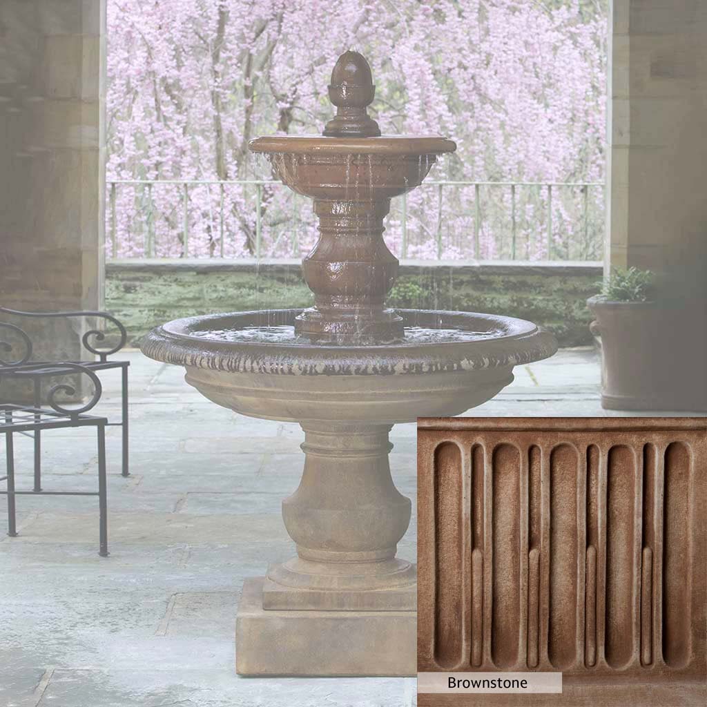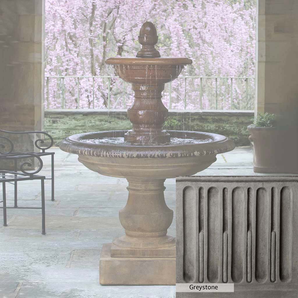 Skilled artisans in the USA handcraft the San Pietro Fountain. The Campania team applies the unique patina using their experience, making each piece one-of-a-kind. This fountain is shown in the Pietra Nuova color. Campania International's unique cast stone blend is meticulously molded to create each piece used in the construction of this fountain. Due to the materials, manufacturing processes, and variations in photography conditions, natural differences can occur in size, weight, and color. The actual color may vary from the photo.