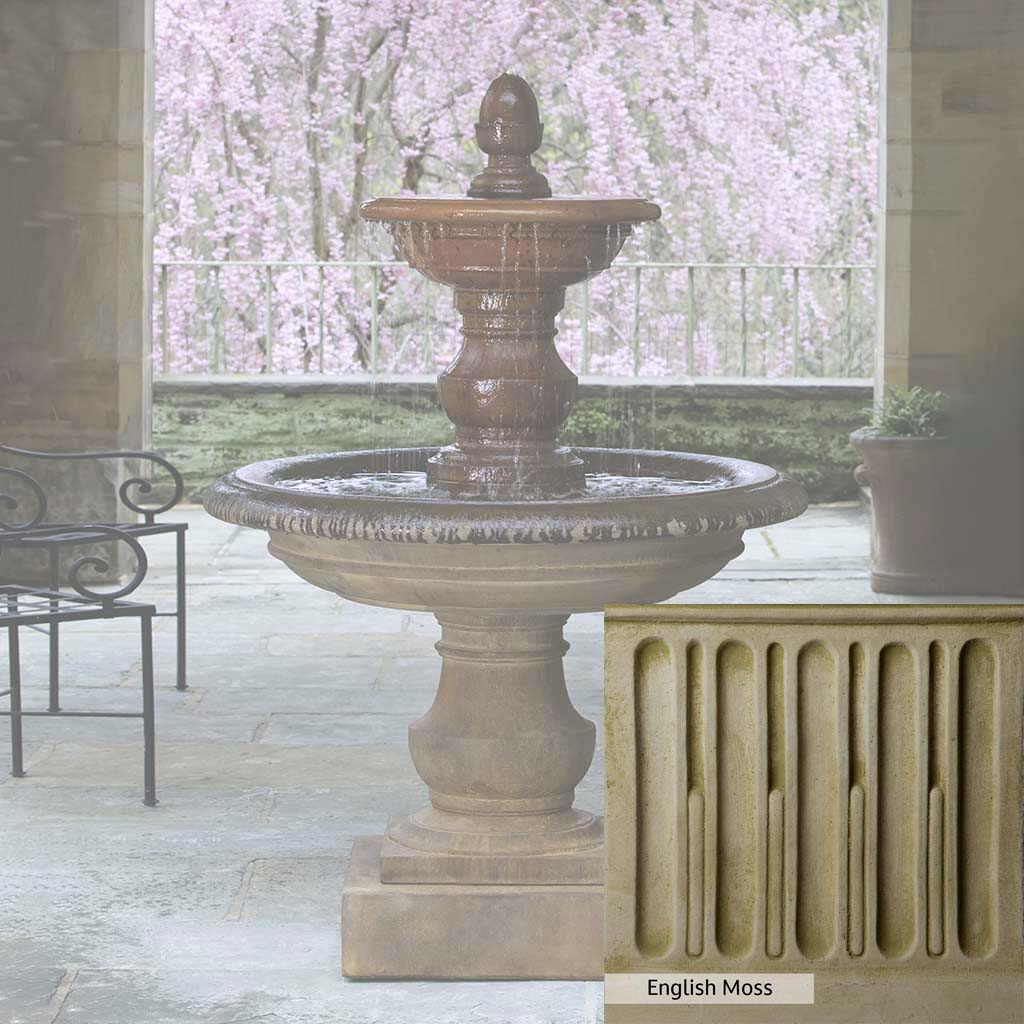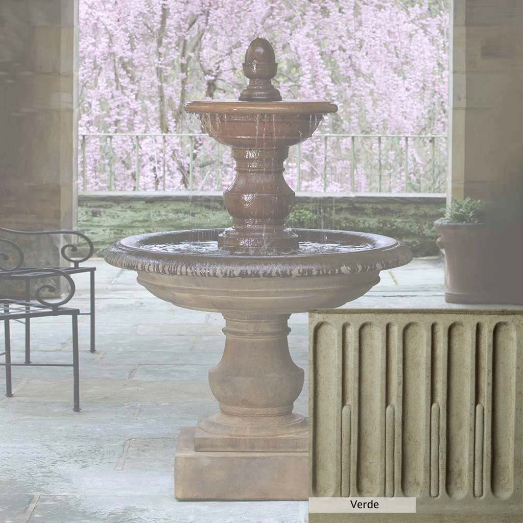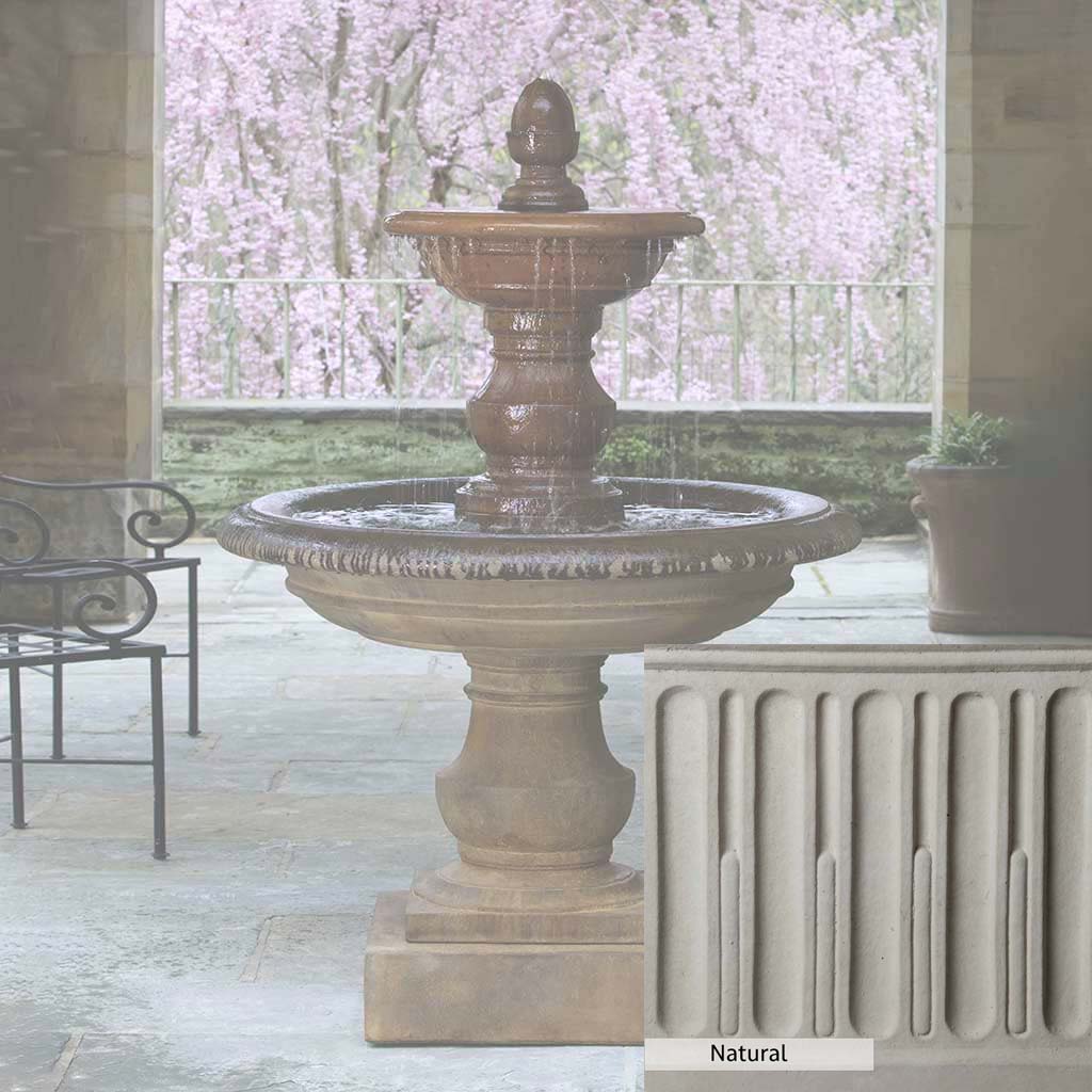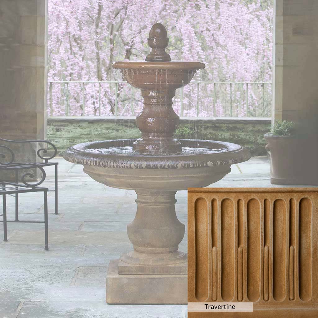 Skilled artisans in the USA handcraft the San Pietro Fountain. The Campania team applies the unique patina using their experience, making each piece one-of-a-kind. This fountain is shown in the Pietra Nuova color. Campania International's unique cast stone blend is meticulously molded to create each piece used in the construction of this fountain. Due to the materials, manufacturing processes, and variations in photography conditions, natural differences can occur in size, weight, and color. The actual color may vary from the photo.