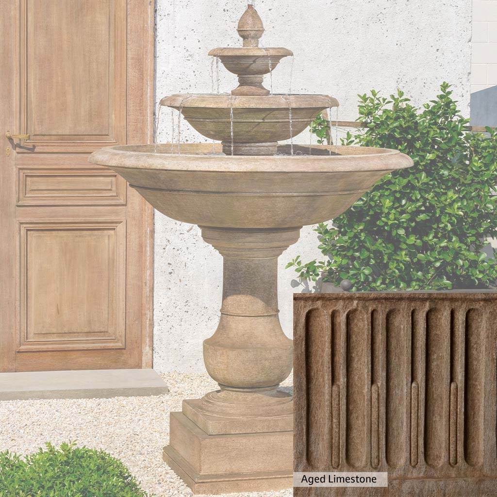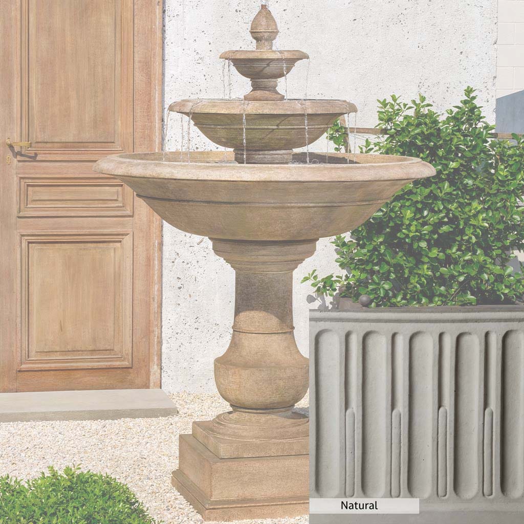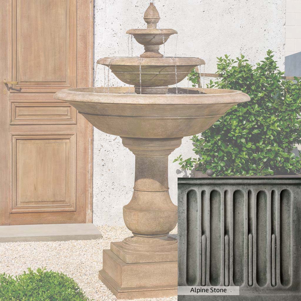 Skilled artisans in the USA handcraft the Savannah Fountain. The Campania team applies the unique patina using their experience, making each piece one-of-a-kind. This fountain is shown in the Travertine color. Campania International's unique cast stone blend is meticulously molded to create each piece used in the construction of this fountain. Due to the materials, manufacturing processes, and variations in photography conditions, natural differences can occur in size, weight, and color. The actual color may vary from the photo.