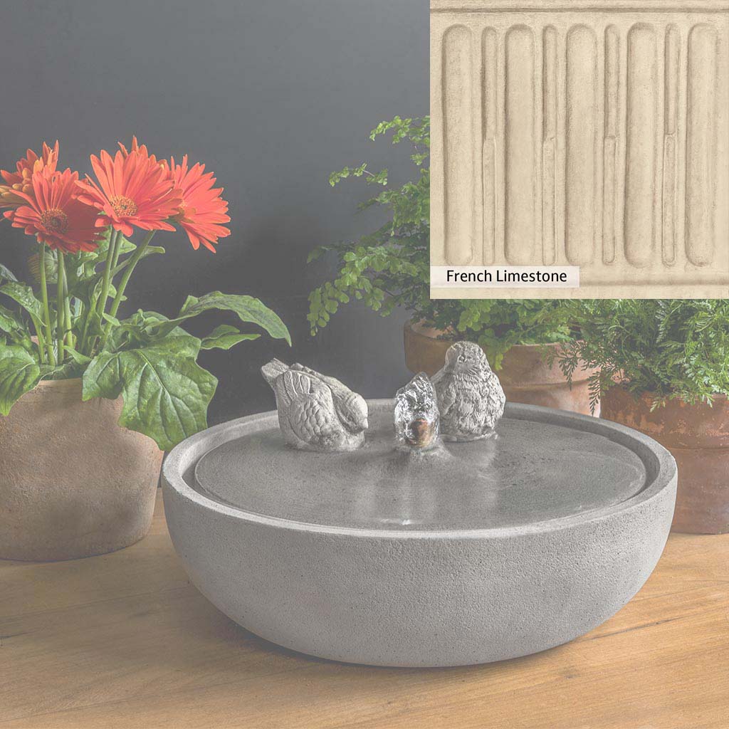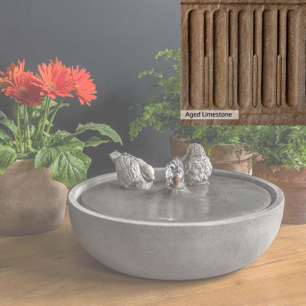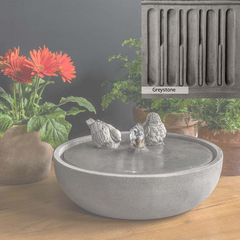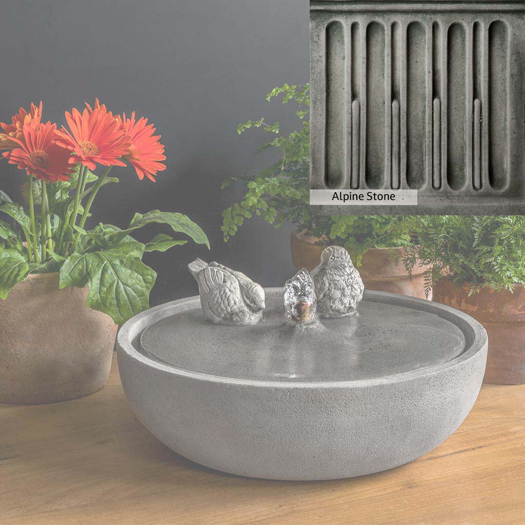 Skilled artisans in the USA handcraft the Songbird Fountain. The Campania team applies the unique patina using their experience, making each piece one-of-a-kind. This fountain is shown in the Alpine Stone color. Campania International's unique cast stone blend is meticulously molded to create each piece used in the construction of this fountain. Due to the materials, manufacturing processes, and variations in photography conditions, natural differences can occur in size, weight, and color. The actual color may vary from the photo.