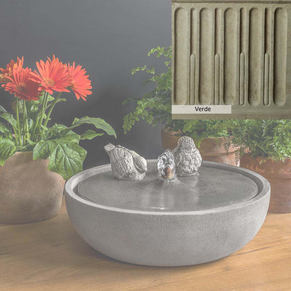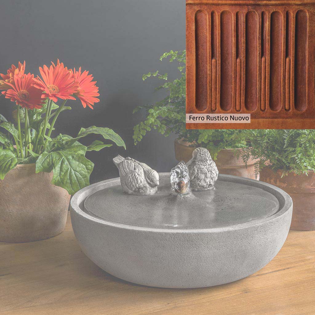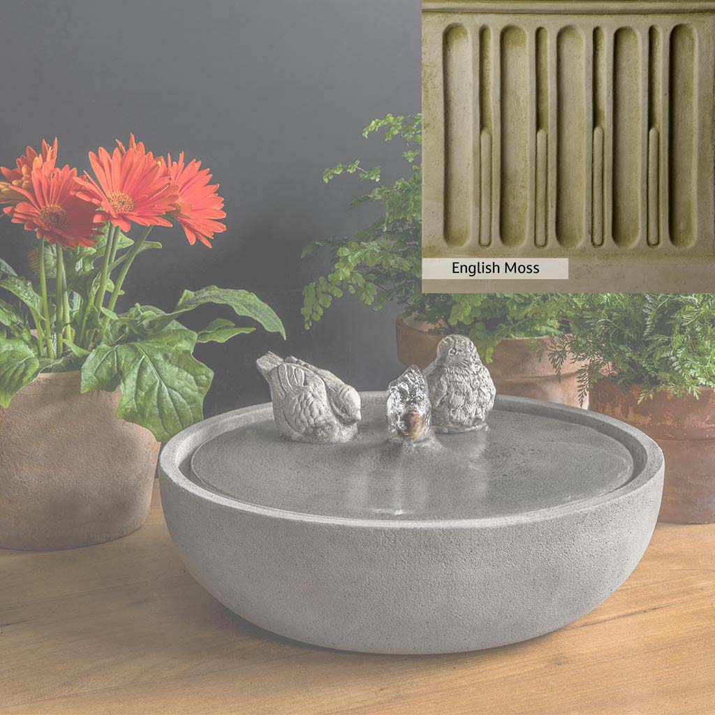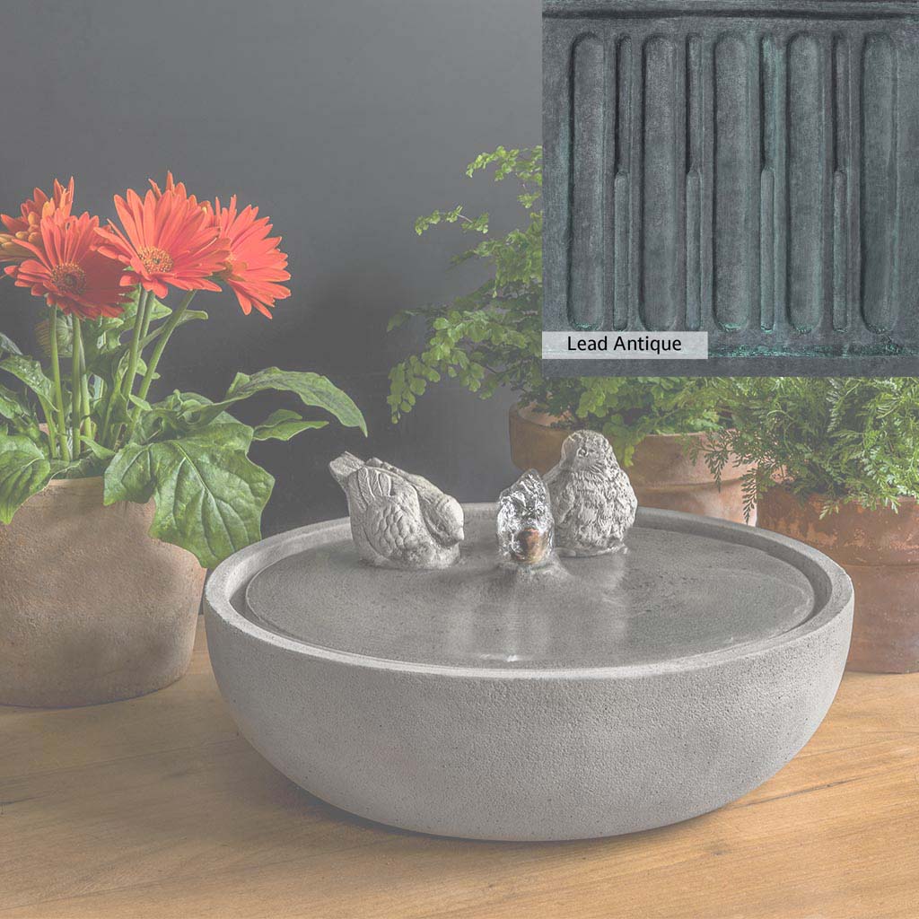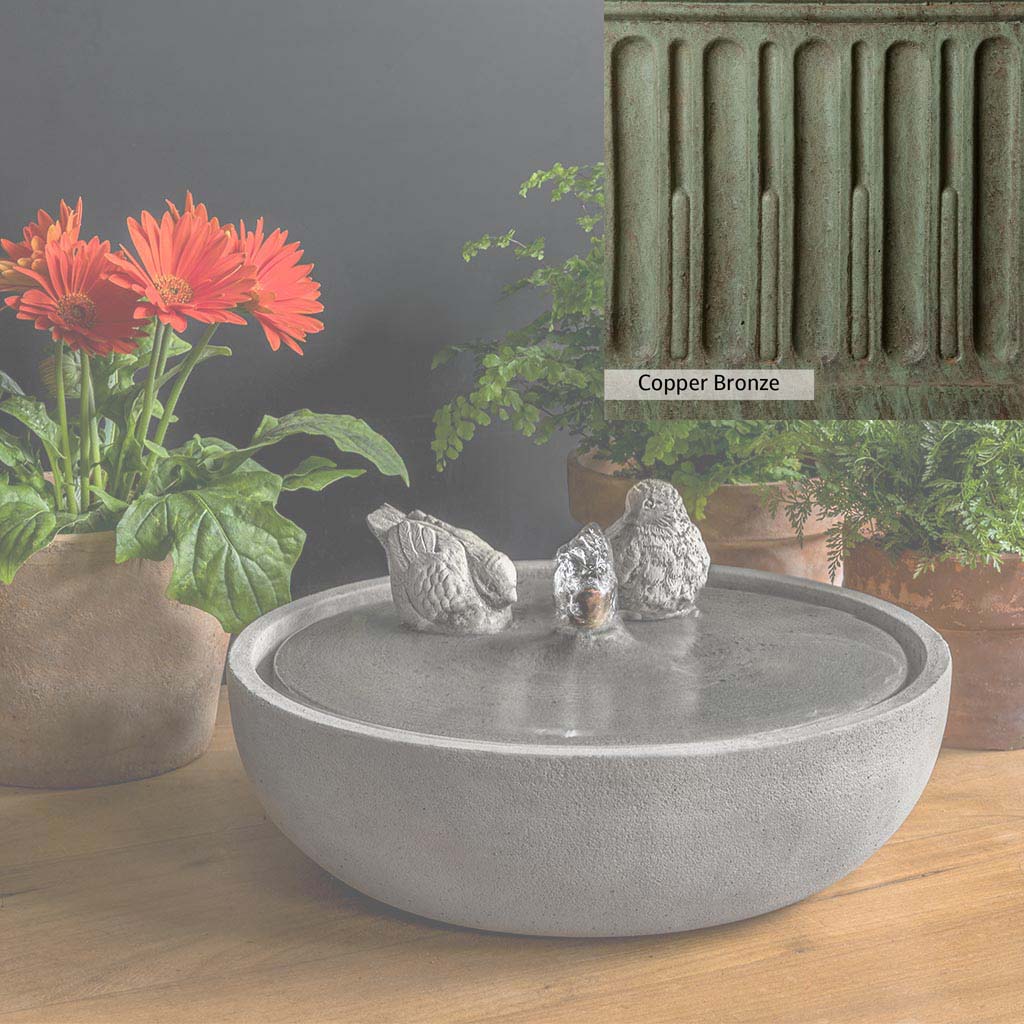 Skilled artisans in the USA handcraft the Songbird Fountain. The Campania team applies the unique patina using their experience, making each piece one-of-a-kind. This fountain is shown in the Alpine Stone color. Campania International's unique cast stone blend is meticulously molded to create each piece used in the construction of this fountain. Due to the materials, manufacturing processes, and variations in photography conditions, natural differences can occur in size, weight, and color. The actual color may vary from the photo.