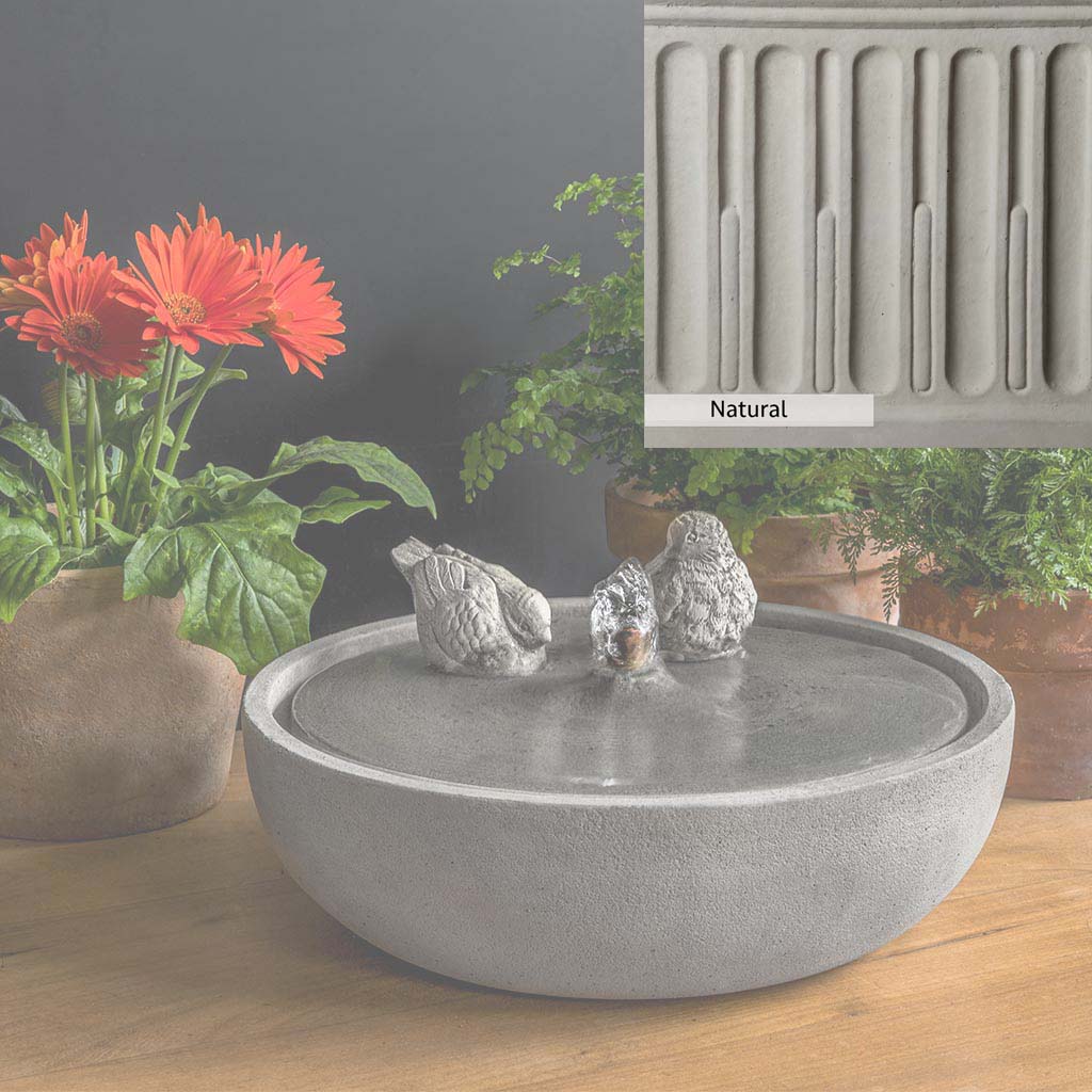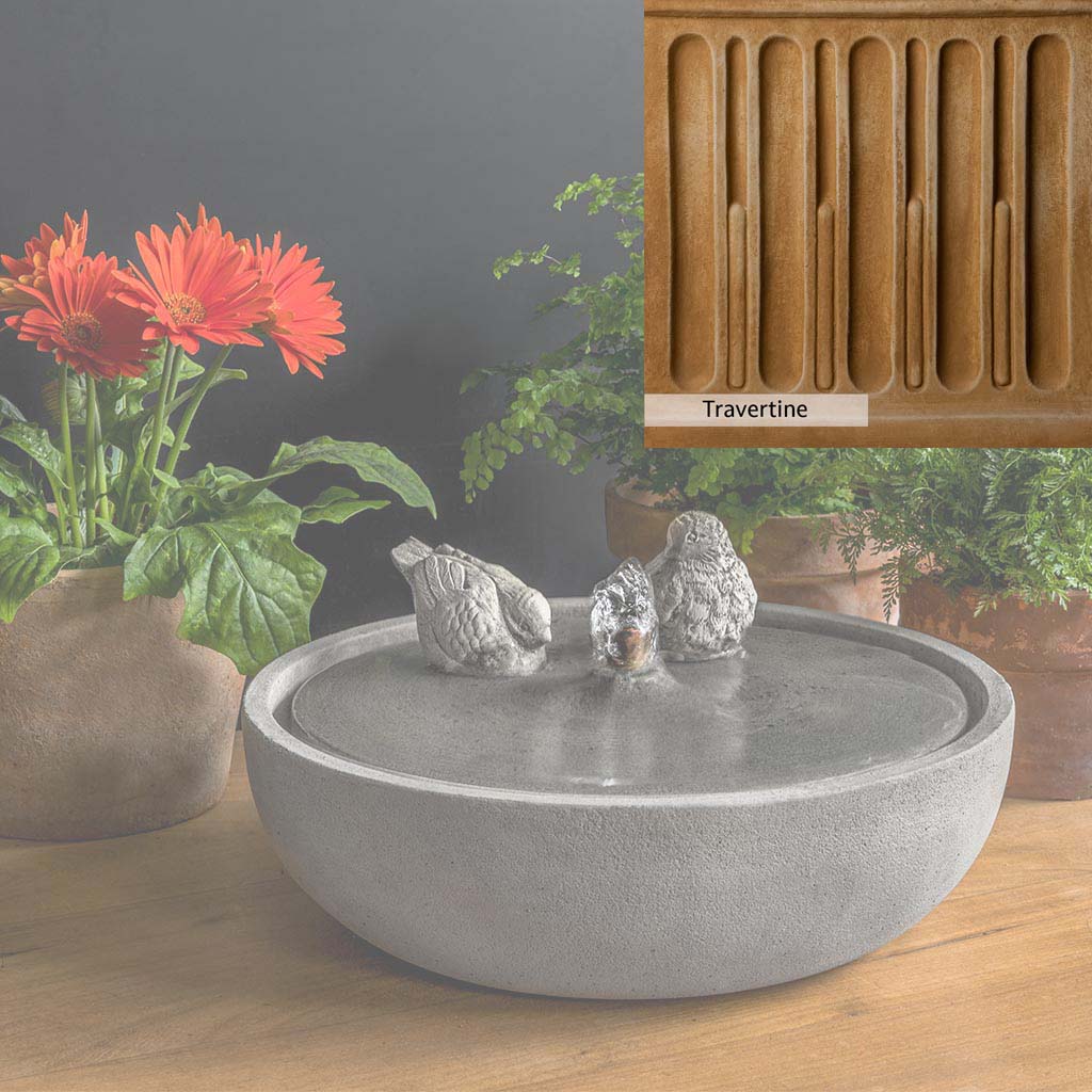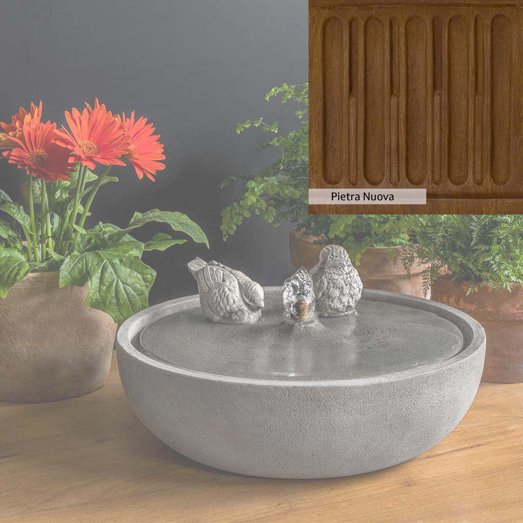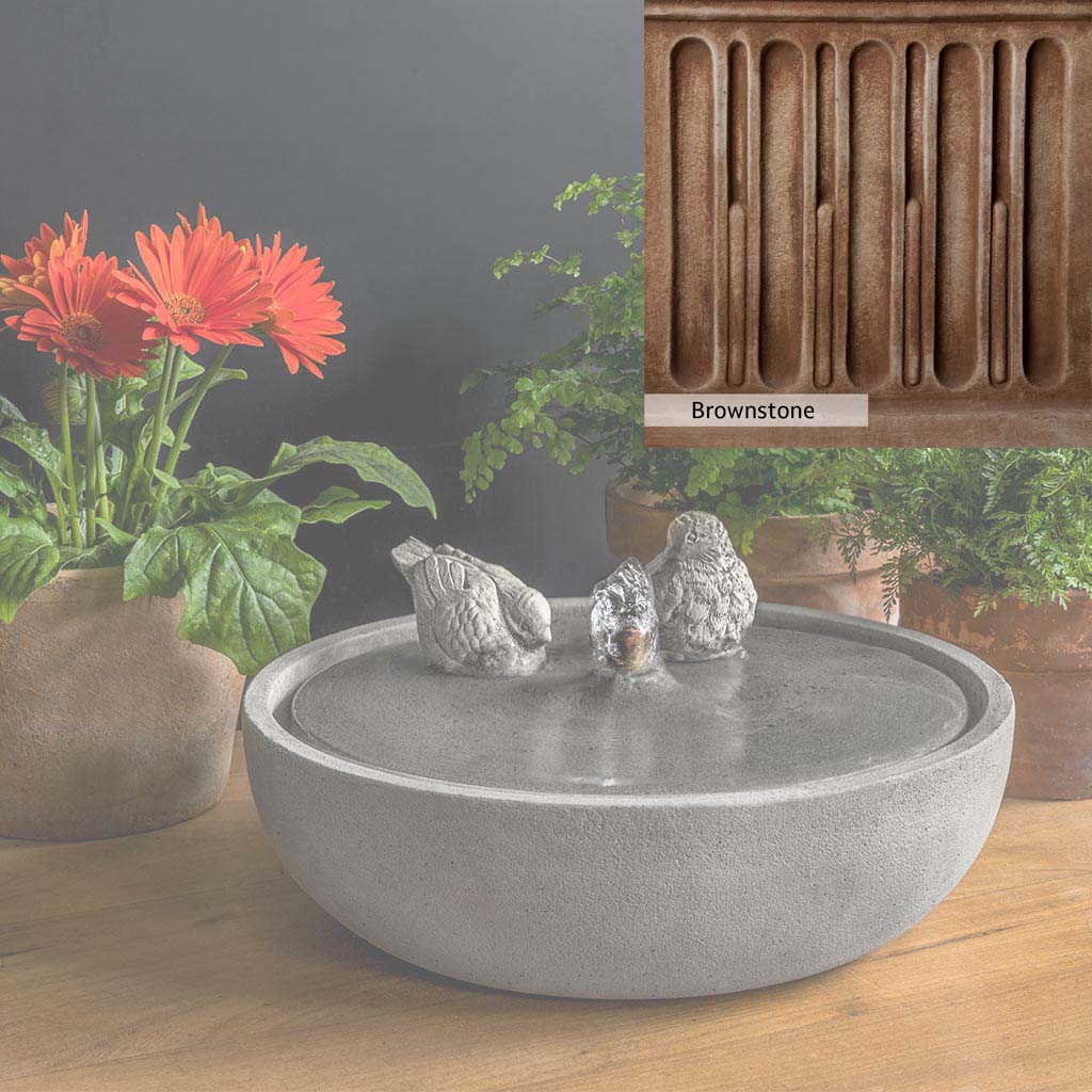 Skilled artisans in the USA handcraft the Songbird Fountain. The Campania team applies the unique patina using their experience, making each piece one-of-a-kind. This fountain is shown in the Alpine Stone color. Campania International's unique cast stone blend is meticulously molded to create each piece used in the construction of this fountain. Due to the materials, manufacturing processes, and variations in photography conditions, natural differences can occur in size, weight, and color. The actual color may vary from the photo.