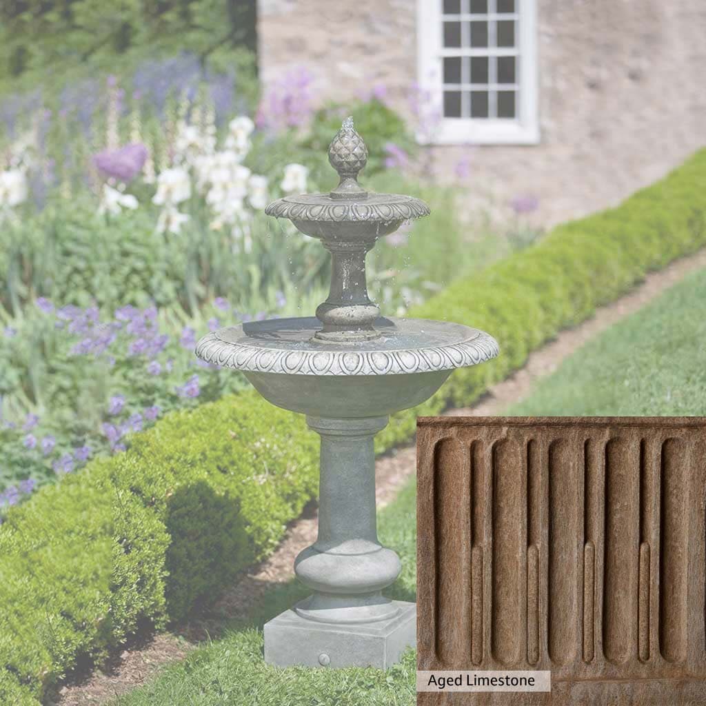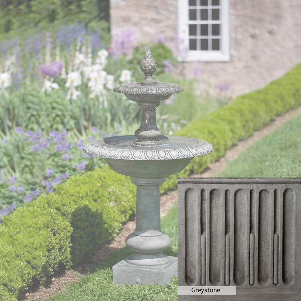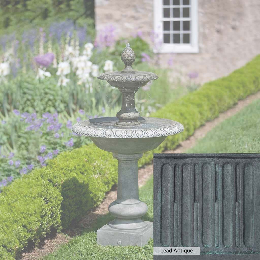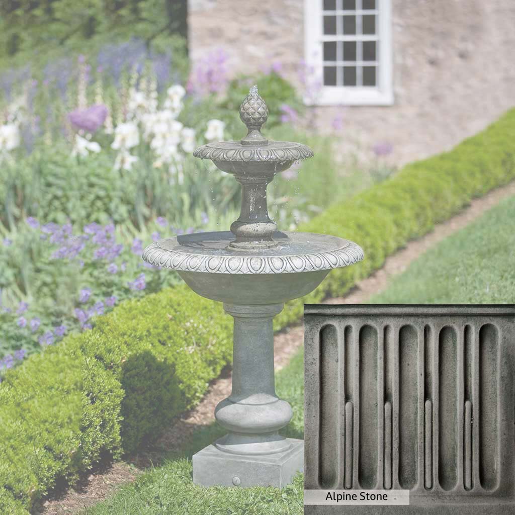 The Williamsburg Pineapple 2 Tier Fountain is handcrafted by skilled artisans in the USA. With their extensive experience, the Campania team applies a unique patina to ensure that each piece is special. This fountain is shown in the Alpine Stone color. Campania International's proprietary cast stone blend is meticulously molded to create each piece used in the construction of this fountain. Due to the use of different materials and manufacturing processes, as well as varying photography conditions, natural variations in size, weight, and color can occur. The actual color may differ from the photo.