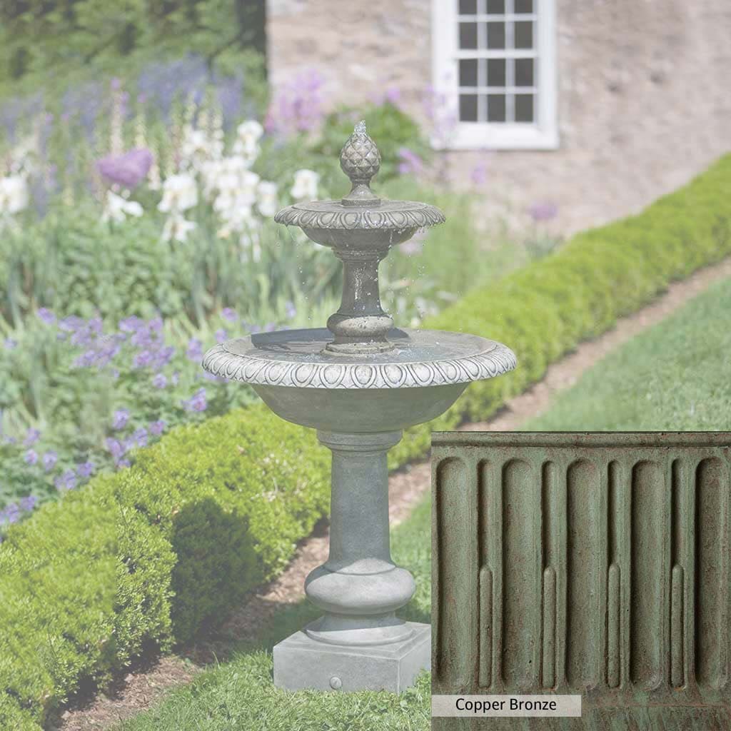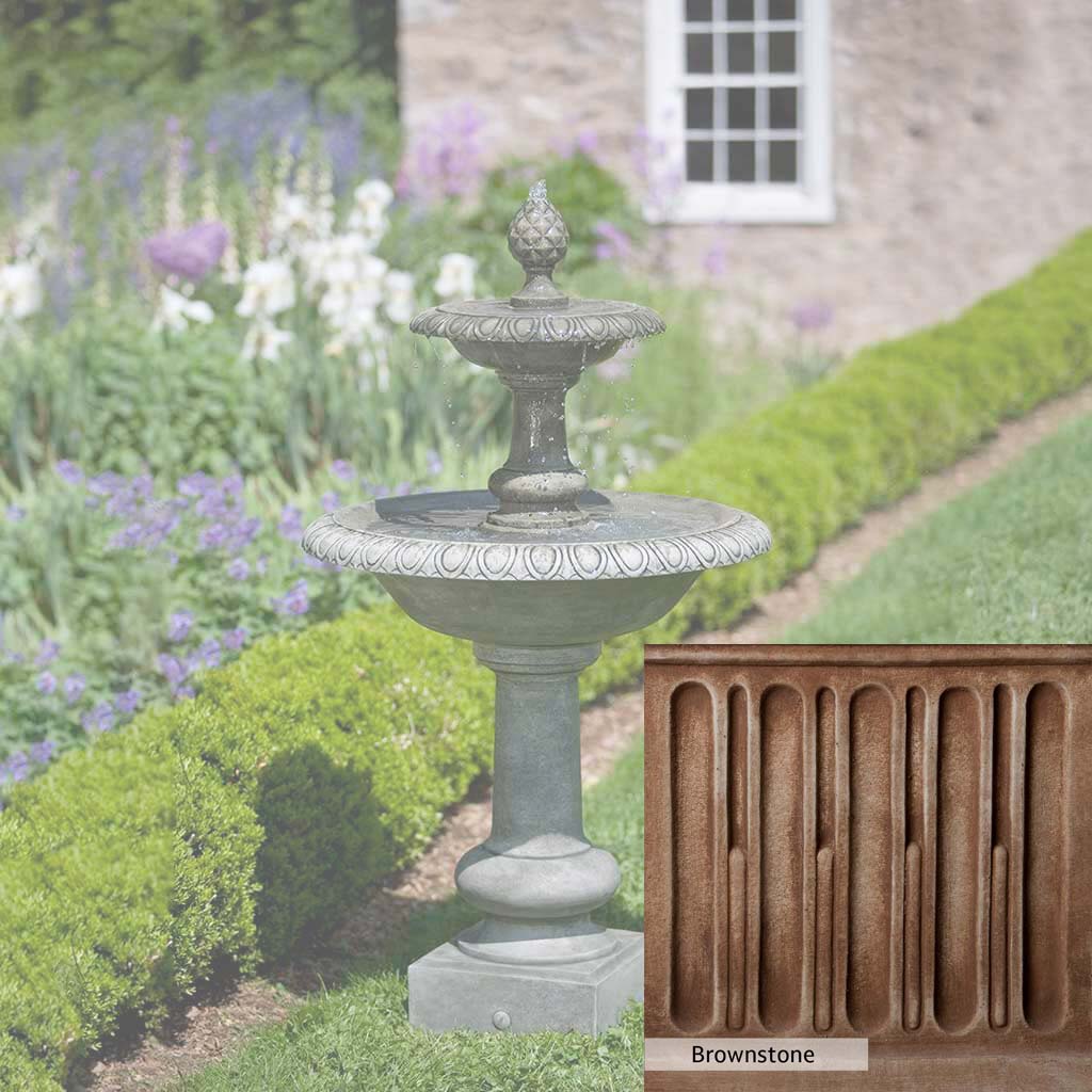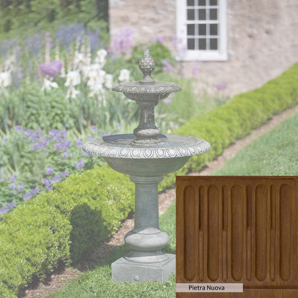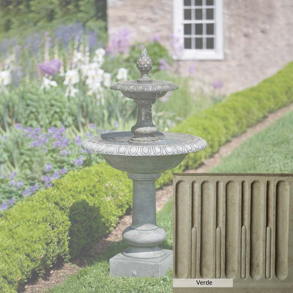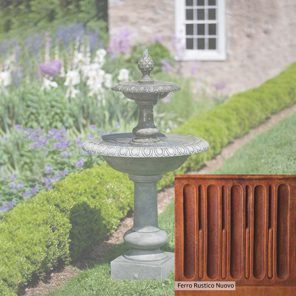 The Williamsburg Pineapple 2 Tier Fountain is handcrafted by skilled artisans in the USA. With their extensive experience, the Campania team applies a unique patina to ensure that each piece is special. This fountain is shown in the Alpine Stone color. Campania International's proprietary cast stone blend is meticulously molded to create each piece used in the construction of this fountain. Due to the use of different materials and manufacturing processes, as well as varying photography conditions, natural variations in size, weight, and color can occur. The actual color may differ from the photo.