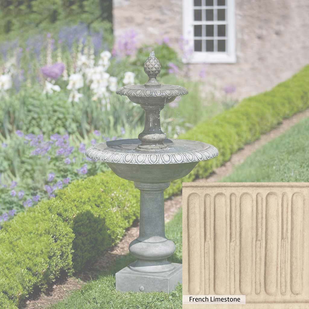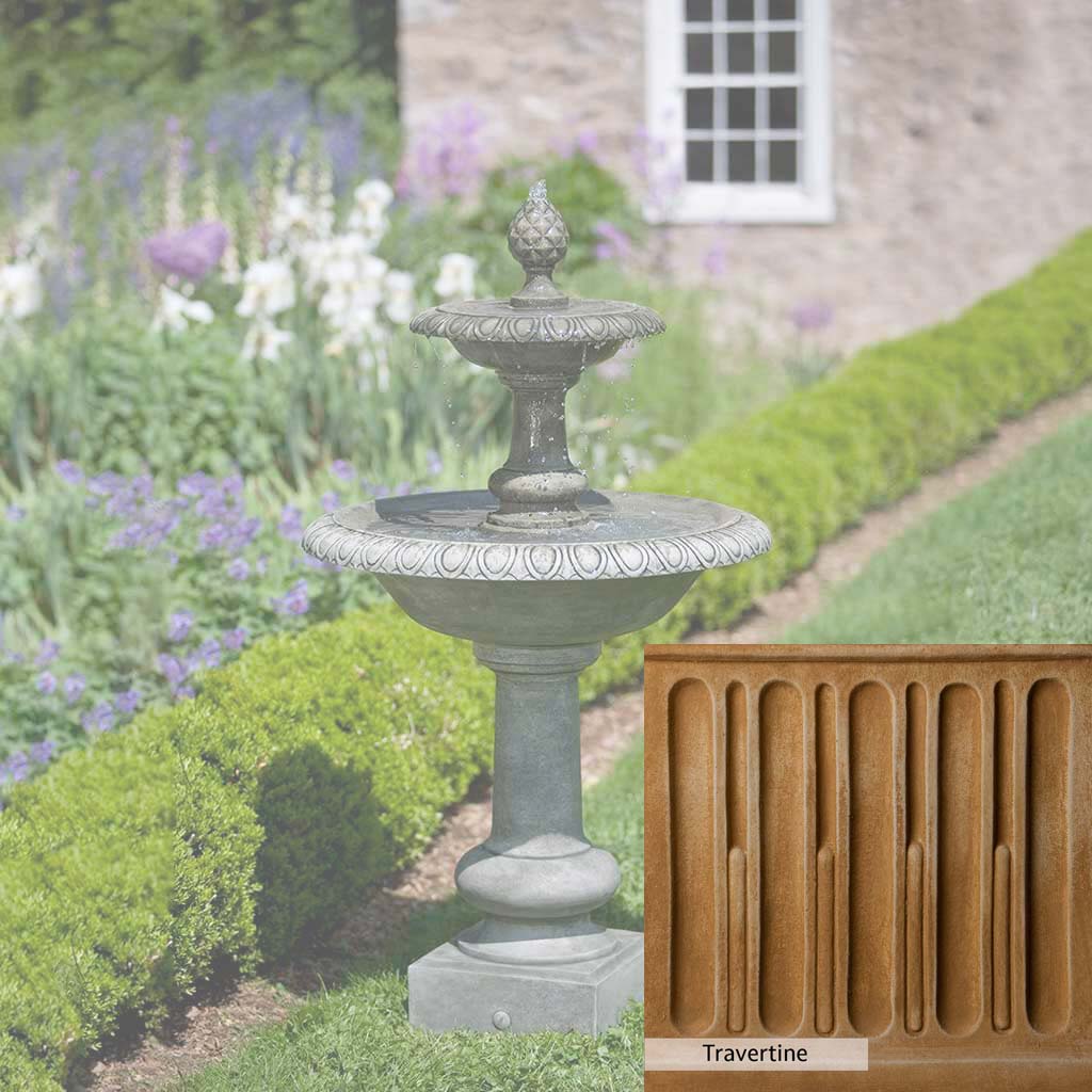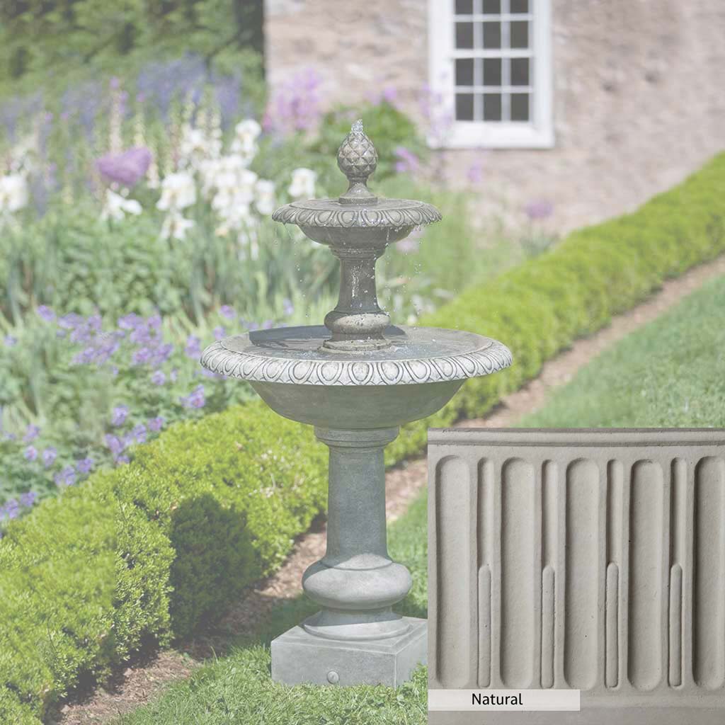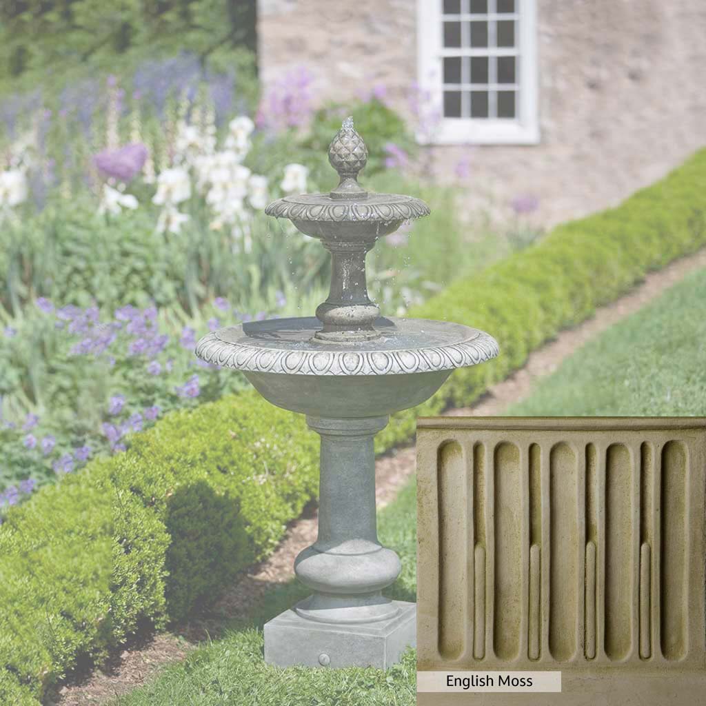 The Williamsburg Pineapple 2 Tier Fountain is handcrafted by skilled artisans in the USA. With their extensive experience, the Campania team applies a unique patina to ensure that each piece is special. This fountain is shown in the Alpine Stone color. Campania International's proprietary cast stone blend is meticulously molded to create each piece used in the construction of this fountain. Due to the use of different materials and manufacturing processes, as well as varying photography conditions, natural variations in size, weight, and color can occur. The actual color may differ from the photo.