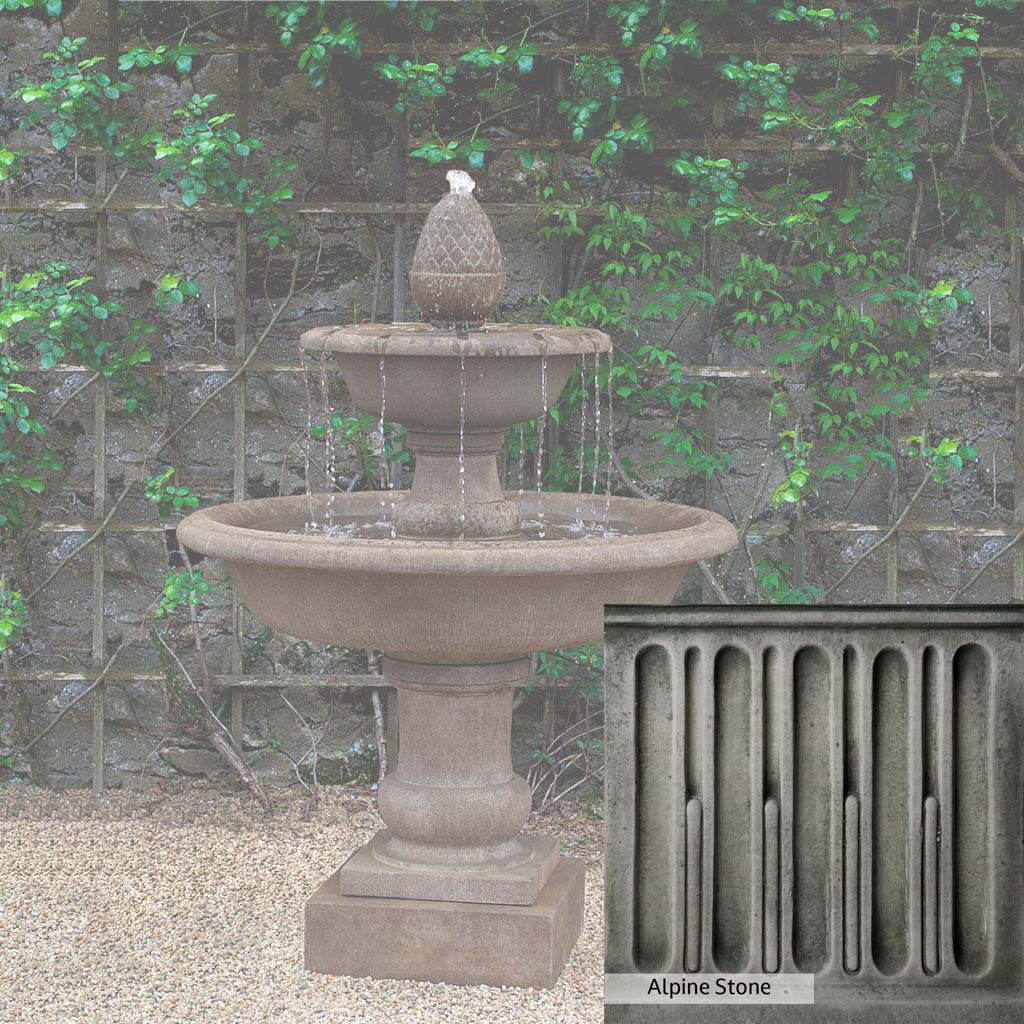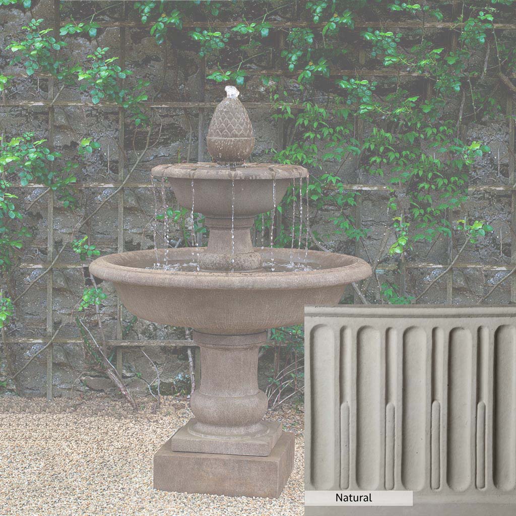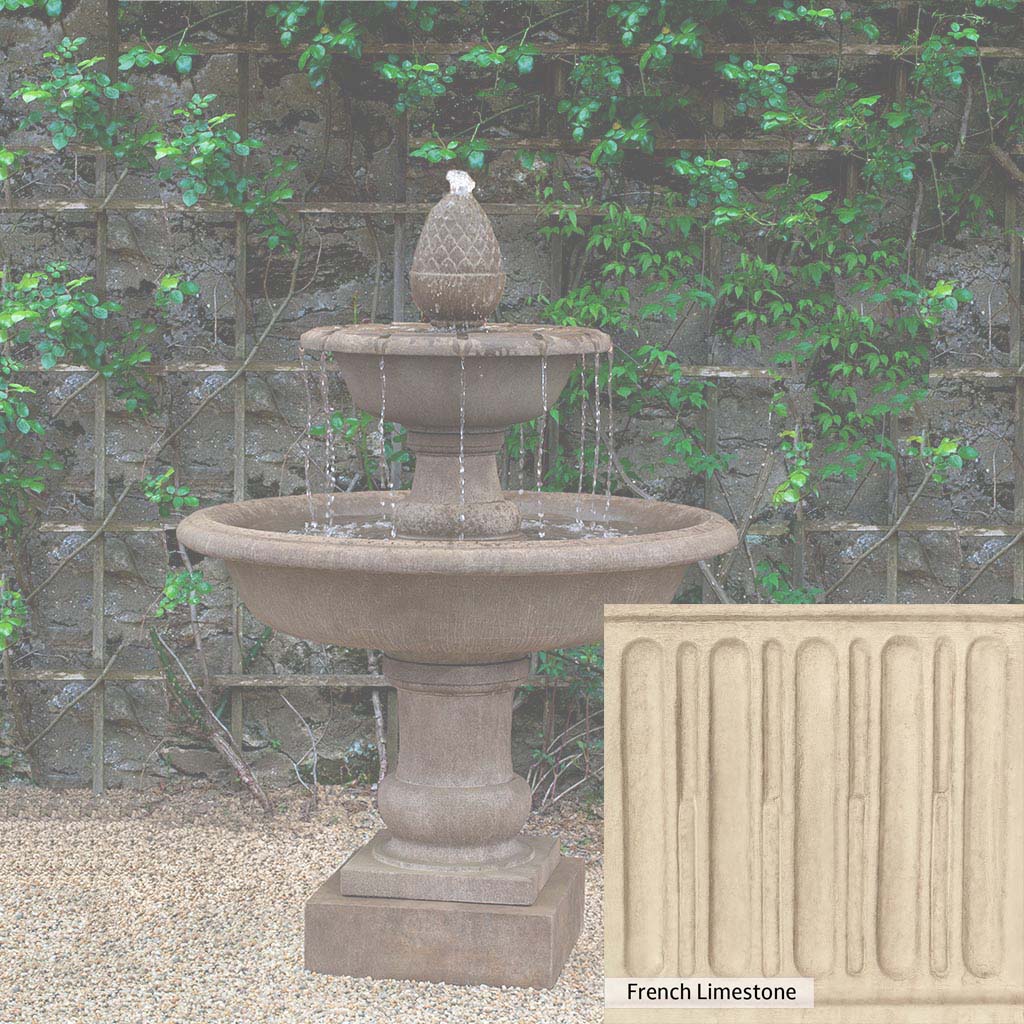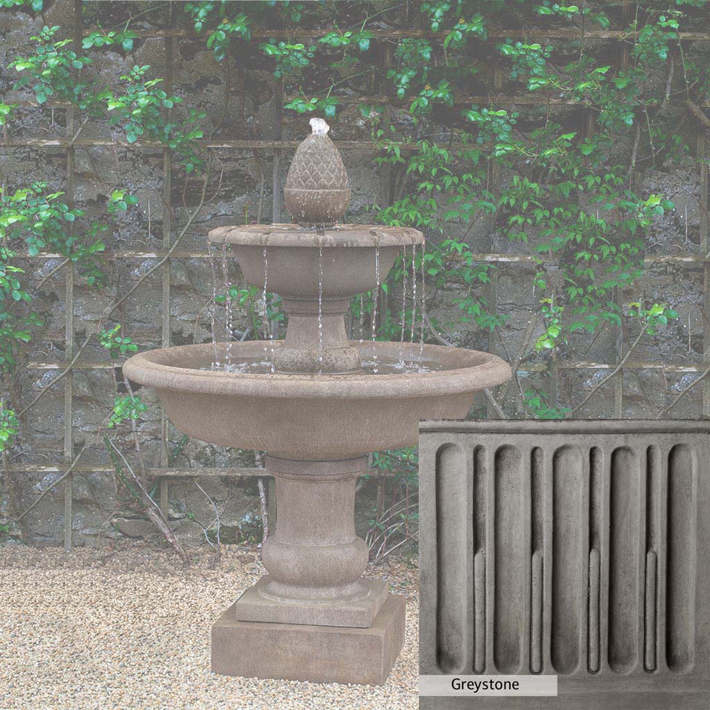 The Wiltshire Fountain is handcrafted by skilled artisans in the USA. The Campania team applies the unique patina with experienced hands, making each piece special. This fountain is featured in the Aged Limestone color. Campania International's exclusive cast stone blend is expertly molded to create each piece in the construction of this fountain. Due to the materials used and manufacturing processes, as well as variations in photography conditions, natural differences may occur in size, weight, and color. The actual color may vary from the photo.
