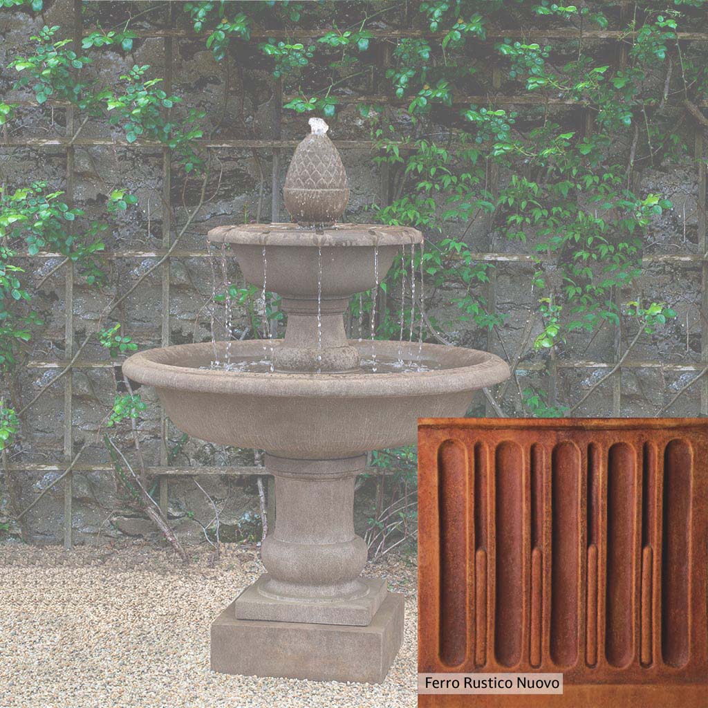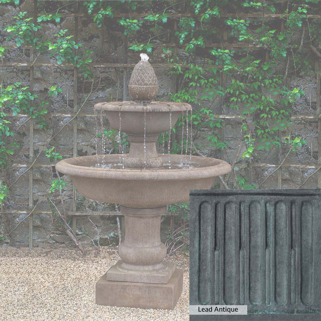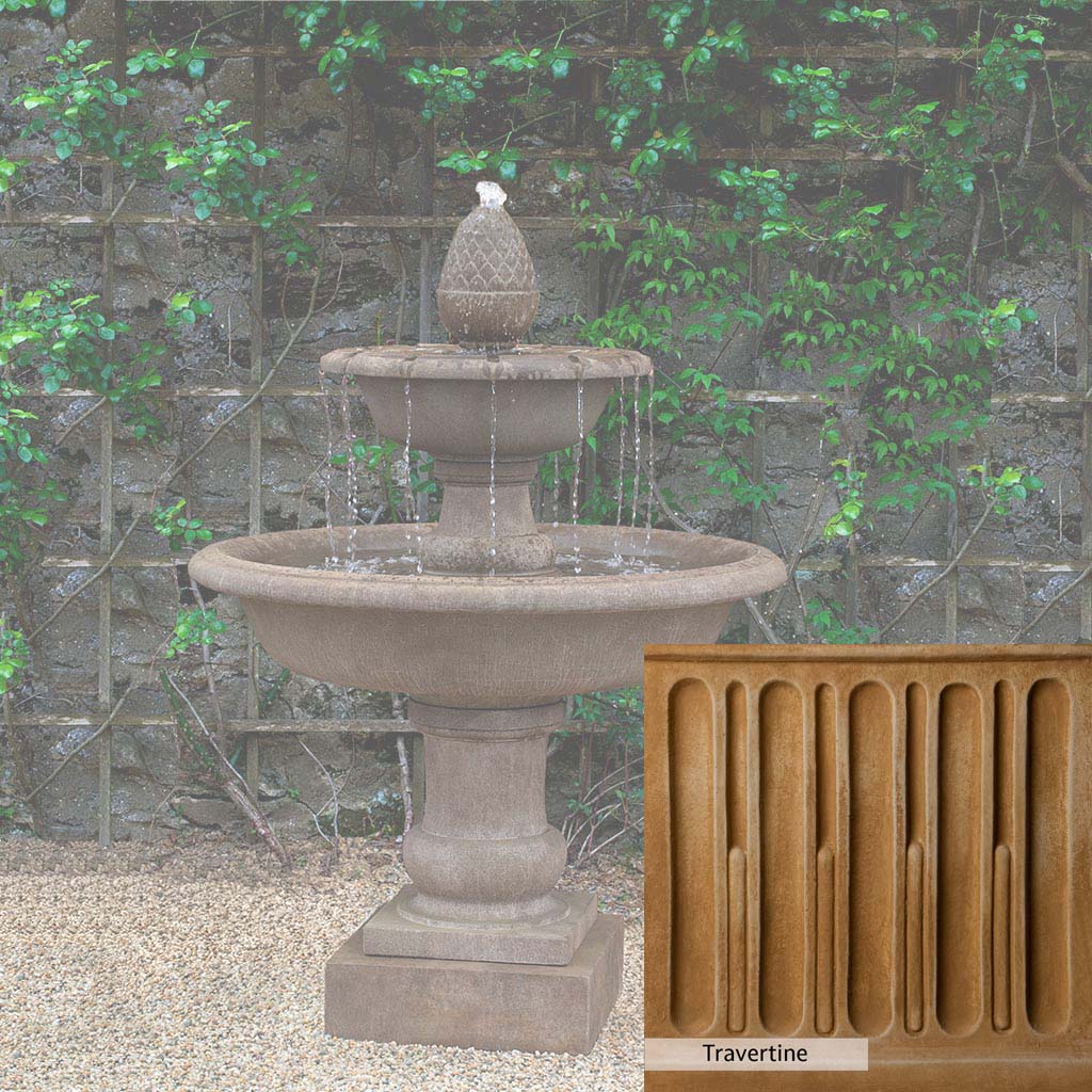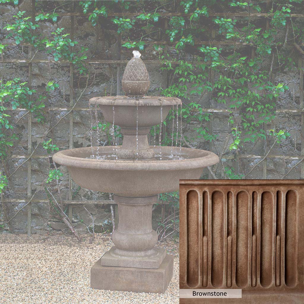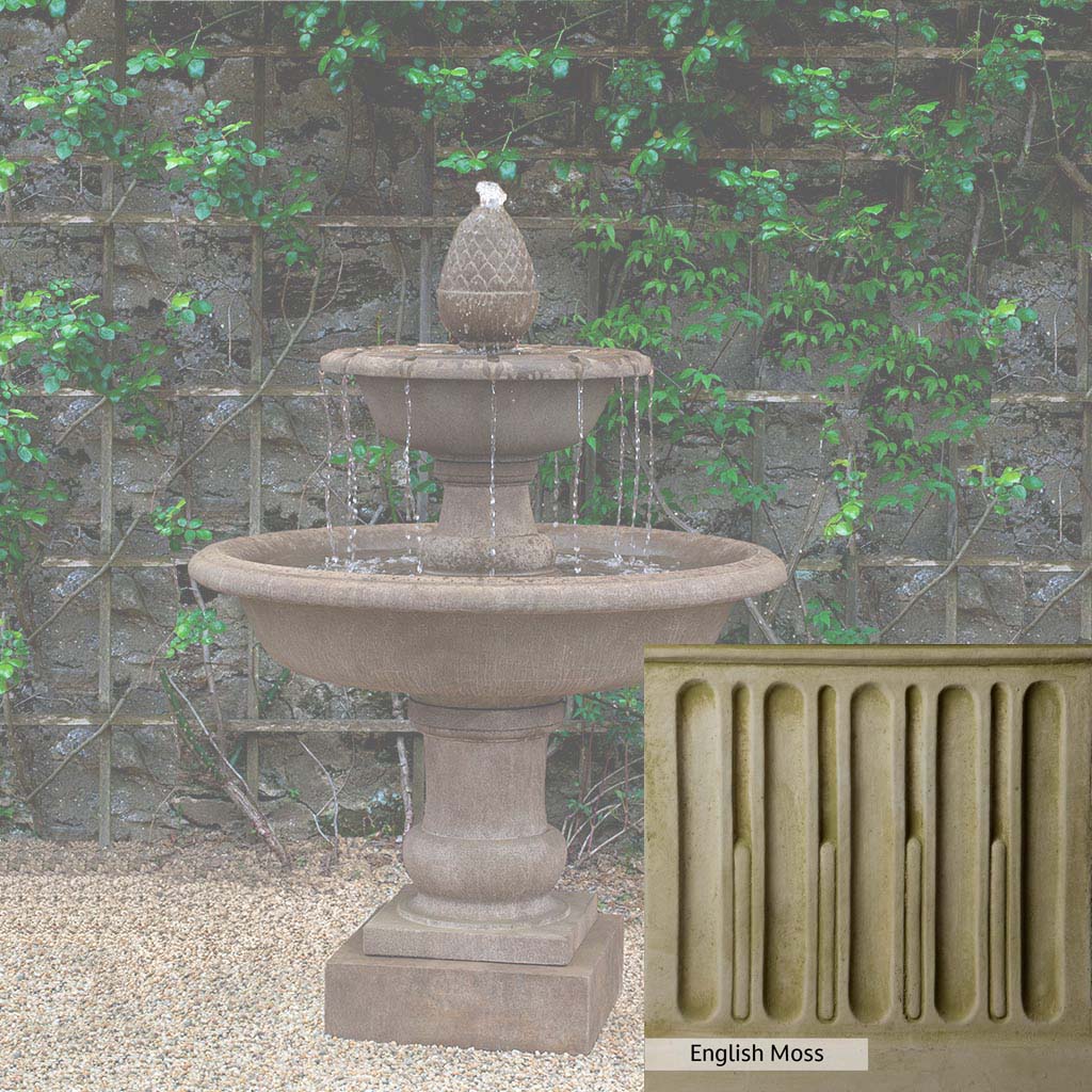 The Wiltshire Fountain is handcrafted by skilled artisans in the USA. The Campania team applies the unique patina with experienced hands, making each piece special. This fountain is featured in the Aged Limestone color. Campania International's exclusive cast stone blend is expertly molded to create each piece in the construction of this fountain. Due to the materials used and manufacturing processes, as well as variations in photography conditions, natural differences may occur in size, weight, and color. The actual color may vary from the photo.