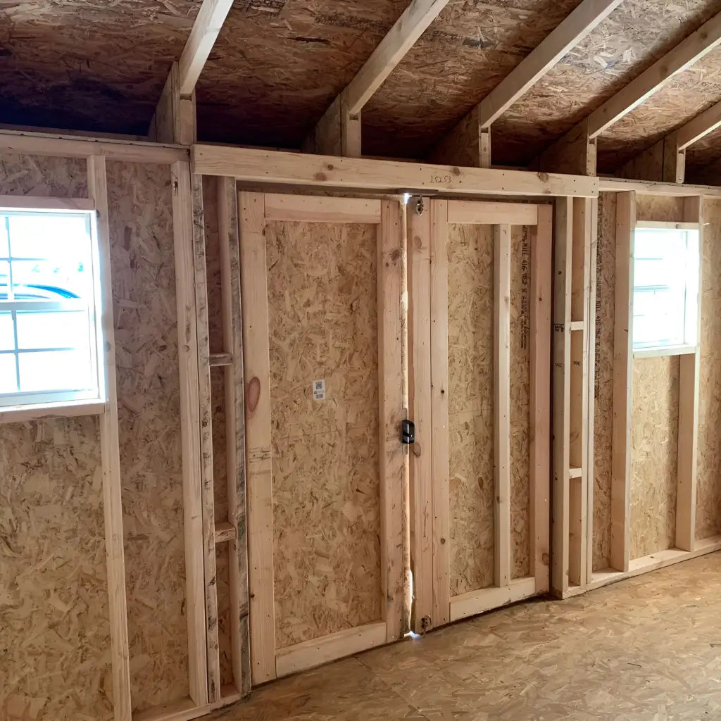 - The wall studs are 2 x 4’s – 16″ on center with 7/16″ L P Smartside siding
