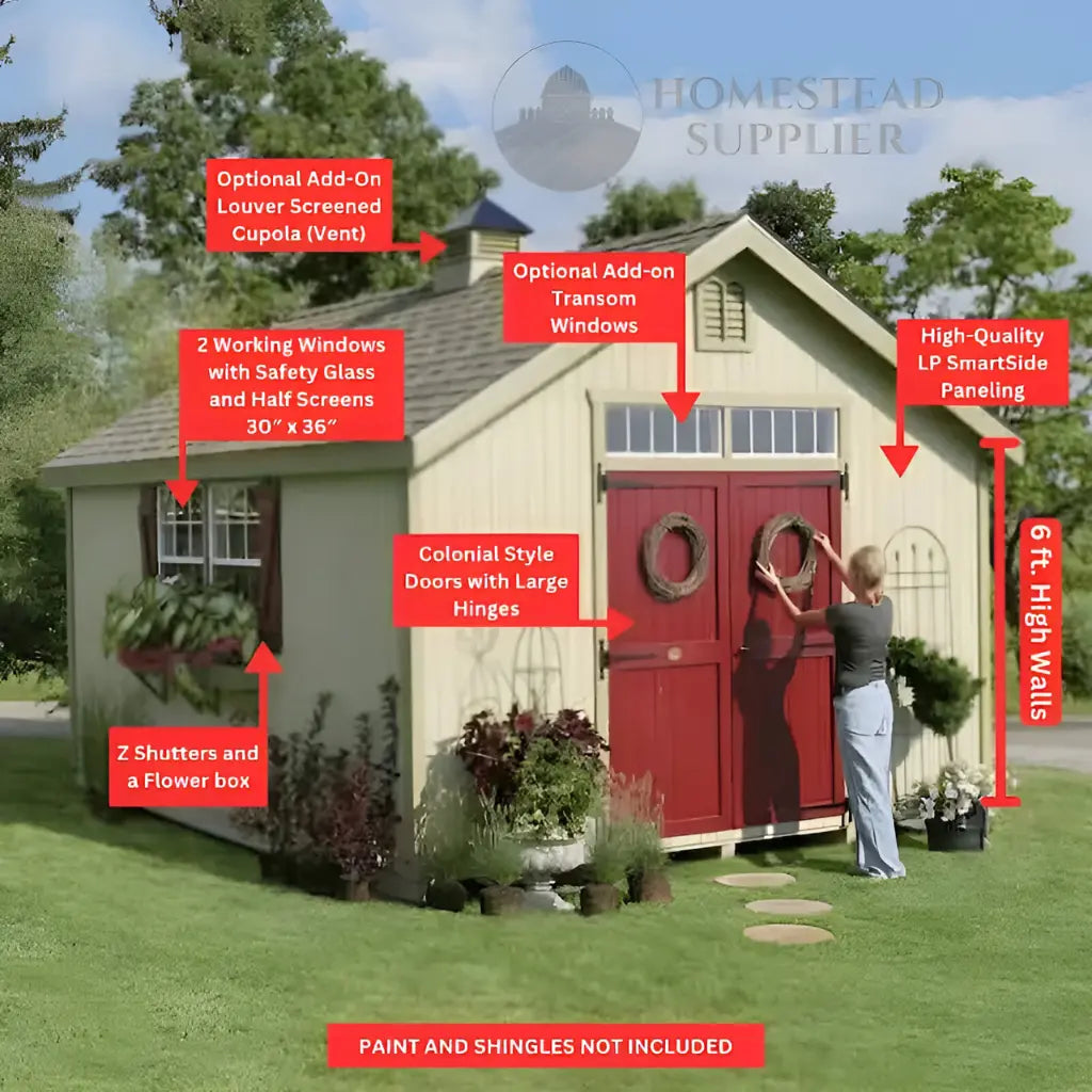 Transform your backyard into a picturesque paradise with the Amish-crafted Colonial Williamsburg Garden Shed. The shed is designed with a captivating colonial double door design, complete with hinges and all necessary hardware for easy installation. Further accentuating its unique charm are two windows, each fitted with screens and Z-style shutters. You can choose from different sizes to fit your needs and customize it to match your home exterior by adding paint and shingles. To further enhance its beauty, you can include additional features such as flower boxes, transom windows, cupolas, and more. Let the Colonial Williamsburg Garden Shed be the highlight of your backyard – get yours today!
