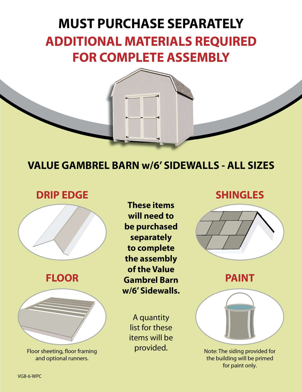 Pre-Cut Kits: The Value Gambrel Barn 6-Foot Sidewalls come with all wood pre-cut to exact lengths. No Extra Cutting is Required! You must assemble the pieces into sections and then put the sections together. Recommended for experienced users.