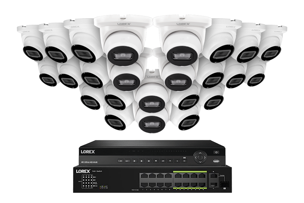 The Lorex Elite Series NVR with A4 4MP (2K) IP Turret Cameras – 4K 32-Channel 8TB Wired System is a professional-grade security solution designed for large-scale properties and businesses. This system offers an expansive 32-channel capacity, allowing you to monitor vast areas with precision. Featuring A4 Series turret cameras, it delivers high-definition 2K video, advanced smart detection, and robust local storage, ensuring comprehensive coverage without the need for monthly cloud subscriptions.